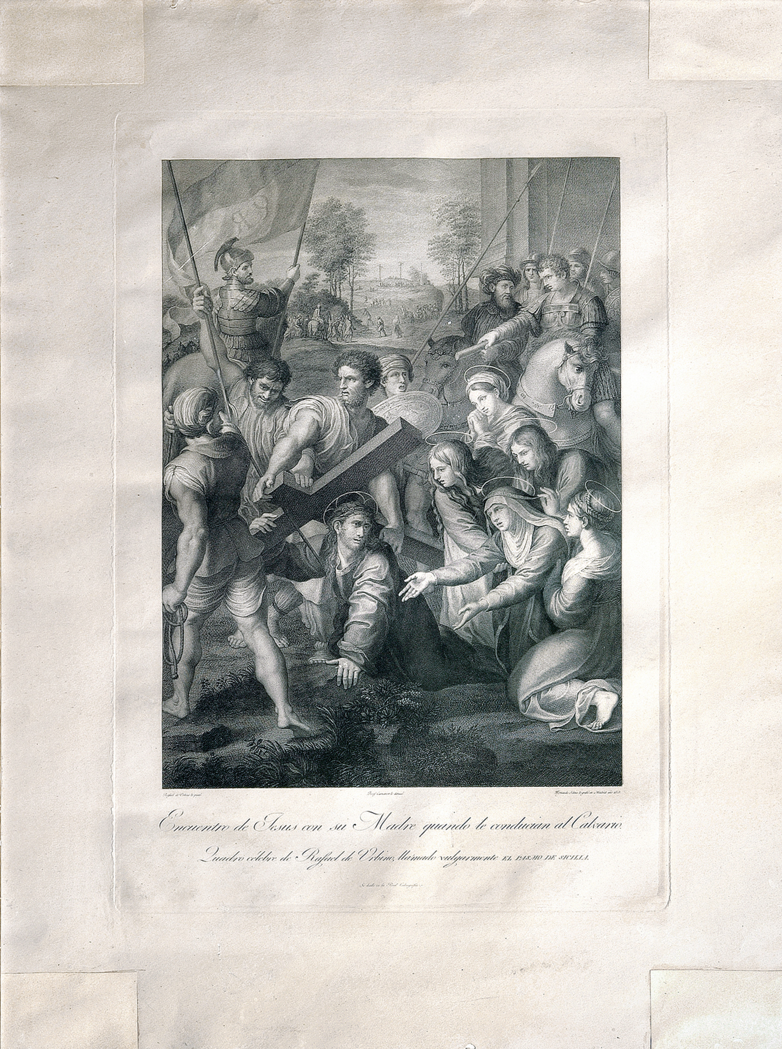 En el ángulo inferior izquierdo: "Rafael de Urbino lo pintó"; en el centro inferior: "Josef Camaron lo dibuxó"; y en el ángulo inferior derecho: "Fernando Selma lo grabó en Madrid año 1808". En la parte inferior figura la siguiente inscripción: "Encuentro de Jesús con su Madre quando le conducían al Calvario./ Quadro célebre de Rafael de Urbino, llamado vulgarmente EL PASMO DE SICILIA".
