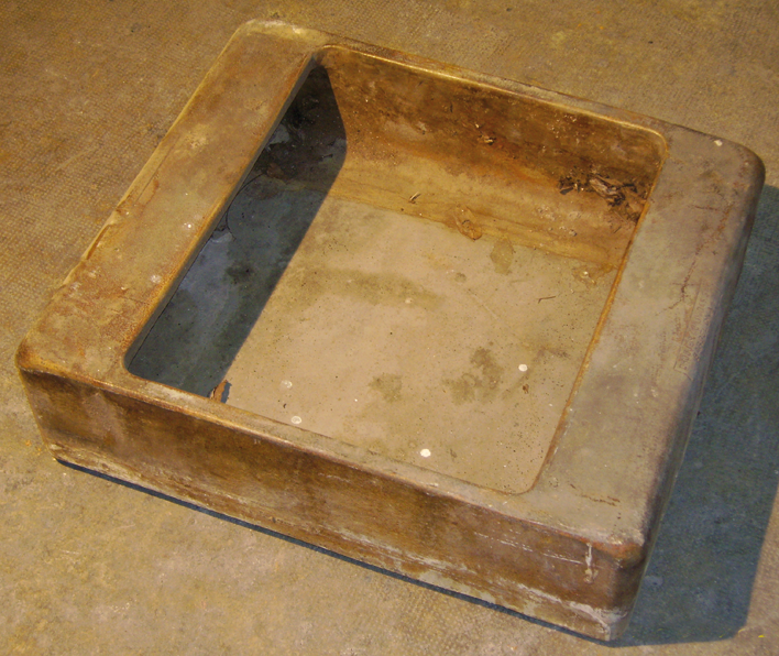 Cubeta con forma cuadrangular y una marcada profundidad en su cuenco, ya que era utilizada para el manejo de diversos líquidos empleados en el trabajo de fotograbado.
