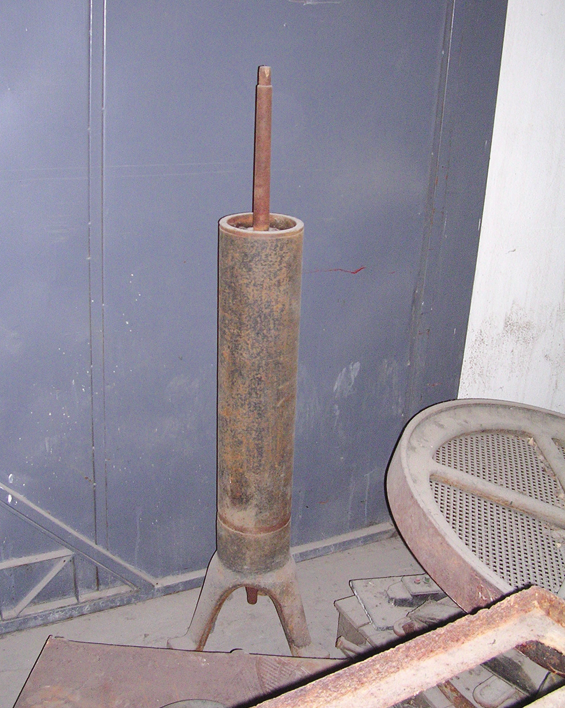 Se trata de una pieza cilíndrica, hueca al interior, colocada en vertical y apoyada sobre tres patas que salen del propio cilindro. De la parte superior asoma un perno, más alto que el cilindro, de sección circular. Se utiliza como molde para obtener los rodillos de goma necesarios para el trabajo de impresión.