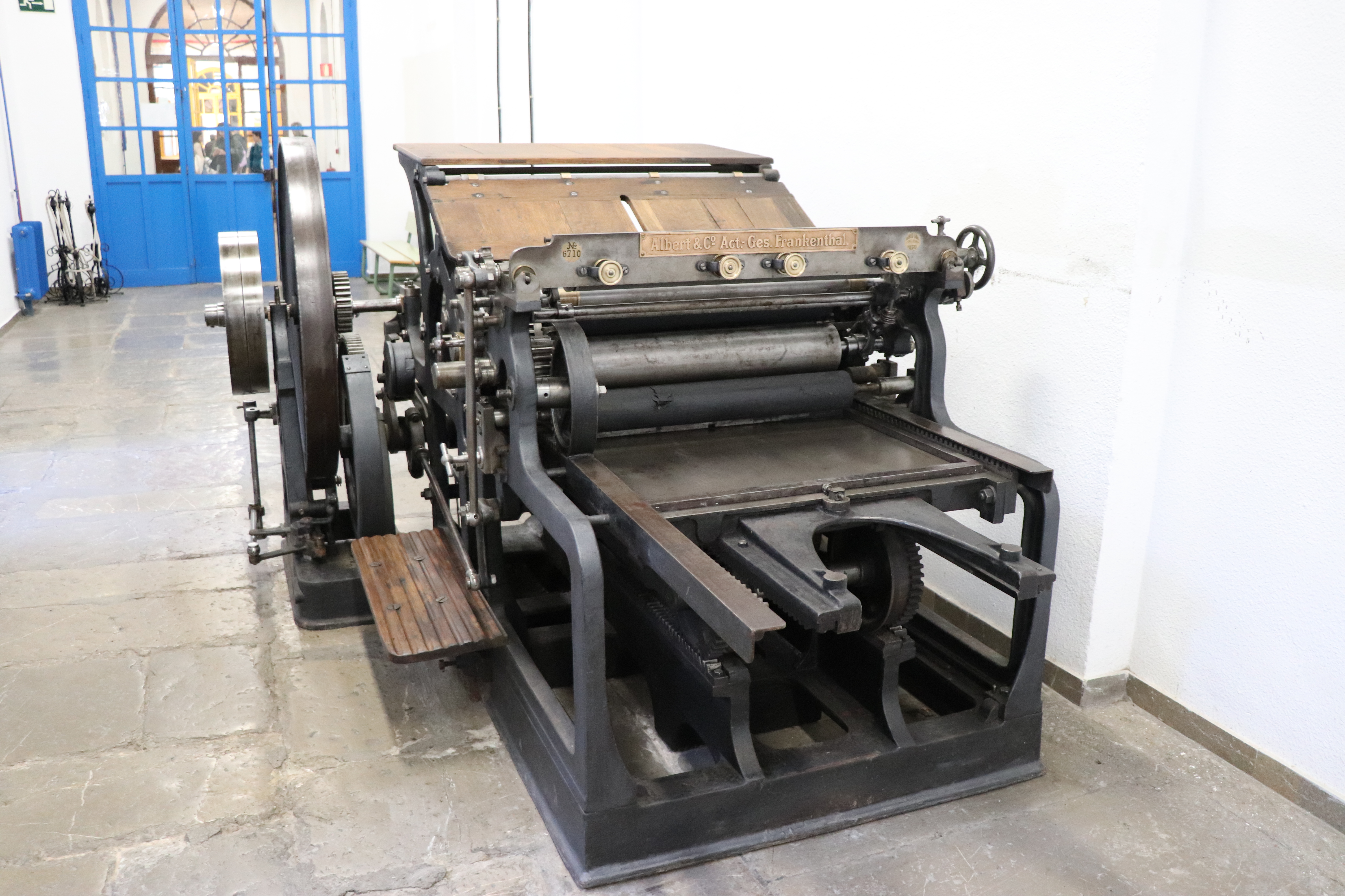 La pieza que vemos aquí es una Prensa plana de cilindro de la empresa Albert & Co., comercializada en España por la casa Richard Gans de Madrid. En este tipo de máquina la forma impresora se coloca sobre una superficie plana mientras que los rodillos entintadores y los pliegos de papel giran sobre ella, presionando contra la forma y realizando así la impresión.