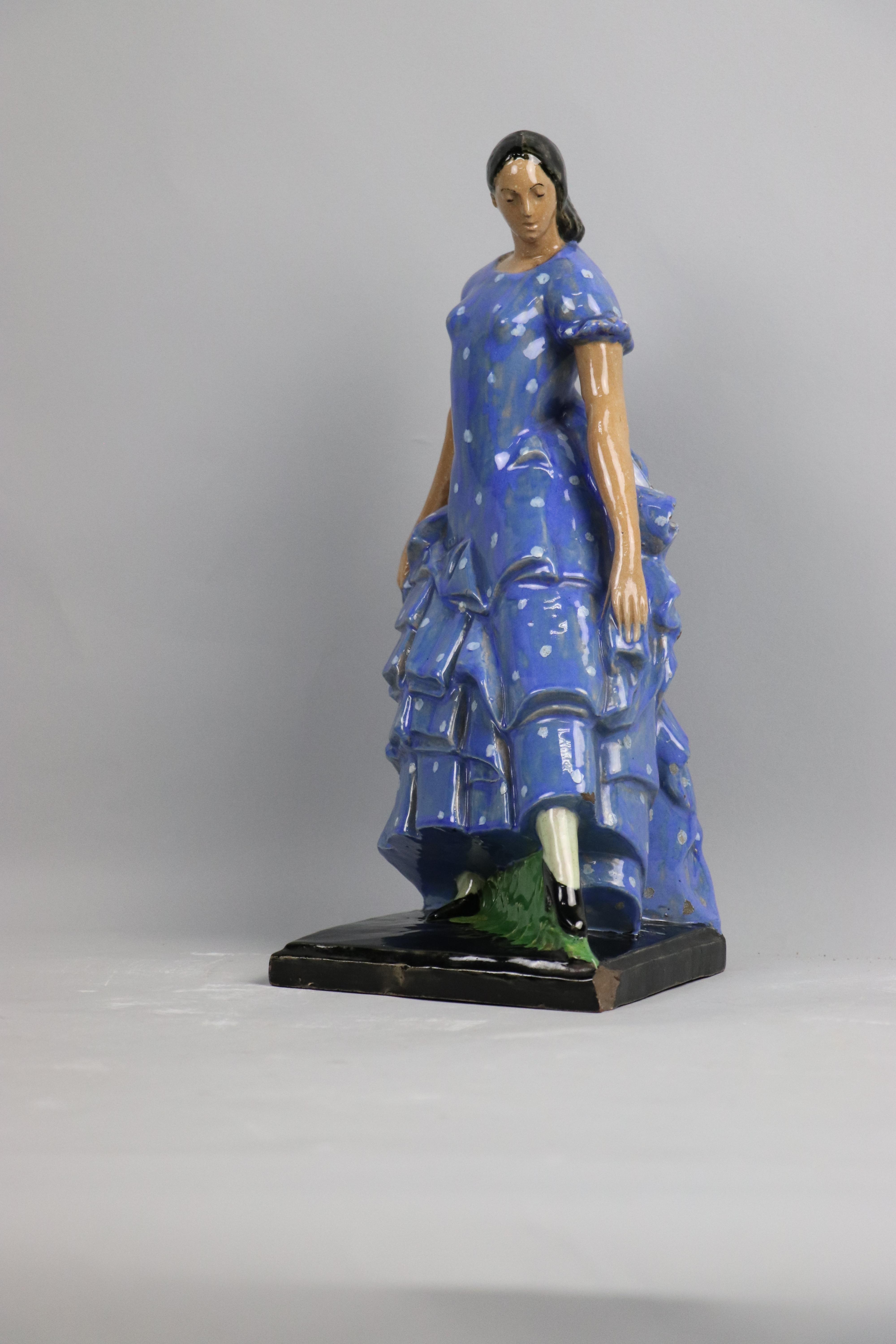 Escultura de bulto redondo realizada a partir del molde CAM00266.00.00, bizcochada y recubierta de esmalte, que representa la figura de una mujer con el atuendo típico de gitana. Así pues, al igual que en otras esculturas del artista, se aprecia la voluntad por mostrar la imagen prototípica del costumbrismo español, y por ende andaluz, asociado al mundo del flamenco. Además, destaca el buen tratamiento de las proporciones, así como el detalle de los pliegues del vestido azul.