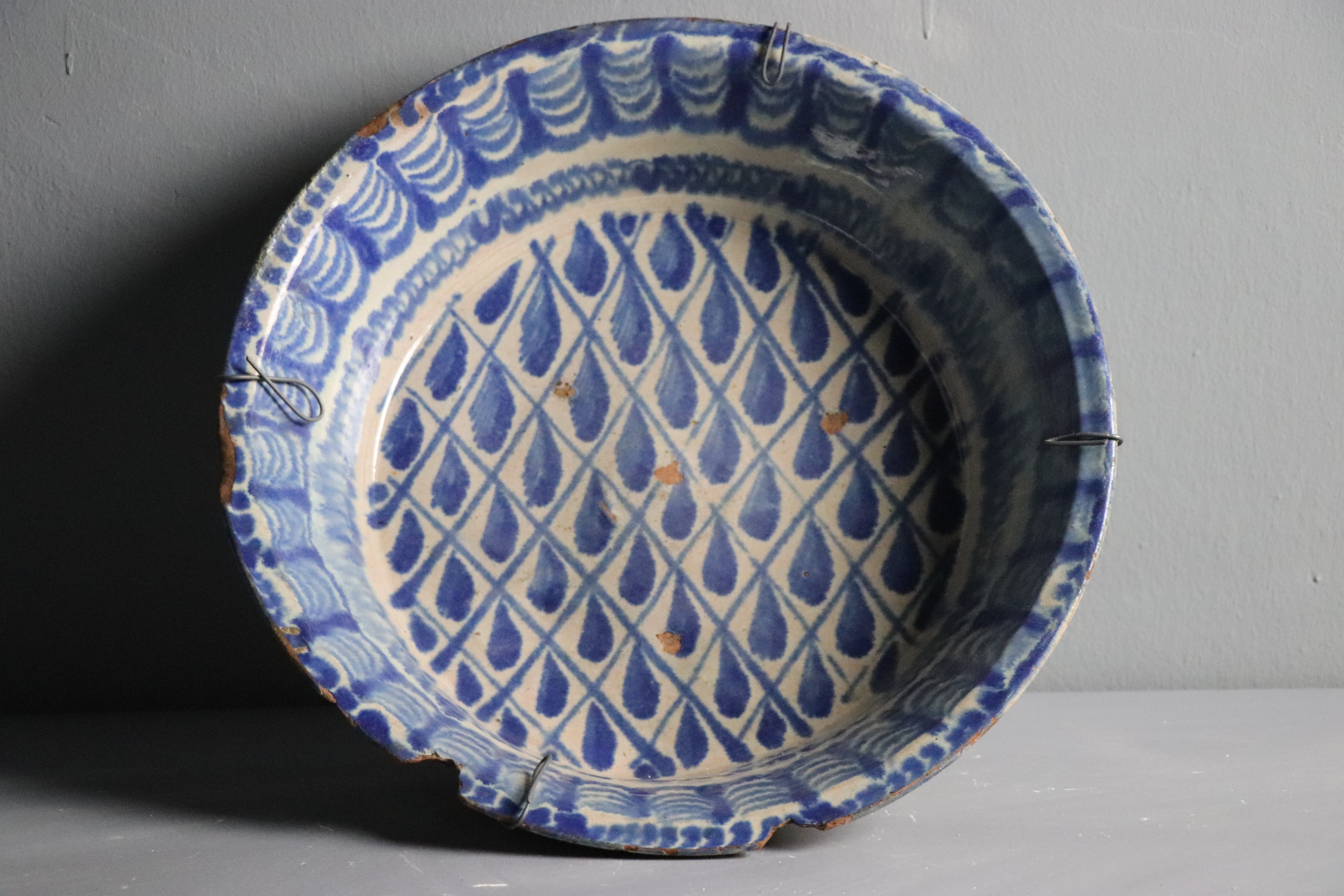 Esta pieza es una fuente semillana que presenta una torta llana, como base, alas inclinadas y borde recto. Está realizada en arcilla torneada en pella de arcilla común y horma, esmaltado en blanco, con monococción en horno árabe, y decoración repintada monócroma en azul cobalto.