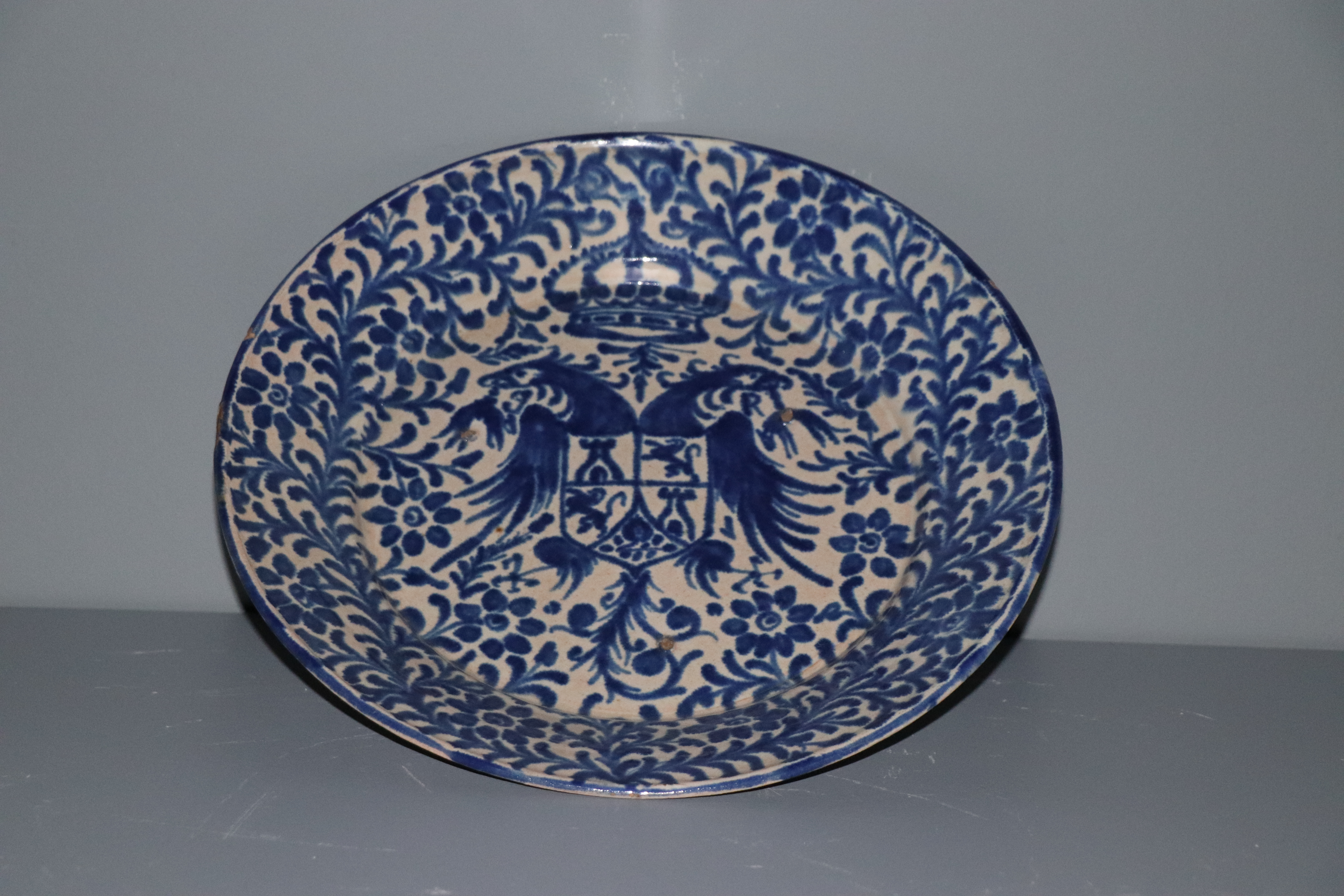 Plato modelado en arcilla, torneado en pella y horma y esmaltado en blanco con decoración de color azul cobalto. En el centro de la cerámica se representa un escudo con el águila bicéfala sujetando un vellocino con cada pico, en el campo dividido en cuatro con dos torres y dos leones rampantes y en la parte inferior una granada y sobre ello la corona imperial, esto hace pensar que es una interpretación del escudo imperial  de Carlos I de España y V de Alemania. El escudo se encuentra rodeado de motivos vegetales y florales, dotando al plato de un carácter solemne y suntuoso. Estado de conservación bueno.