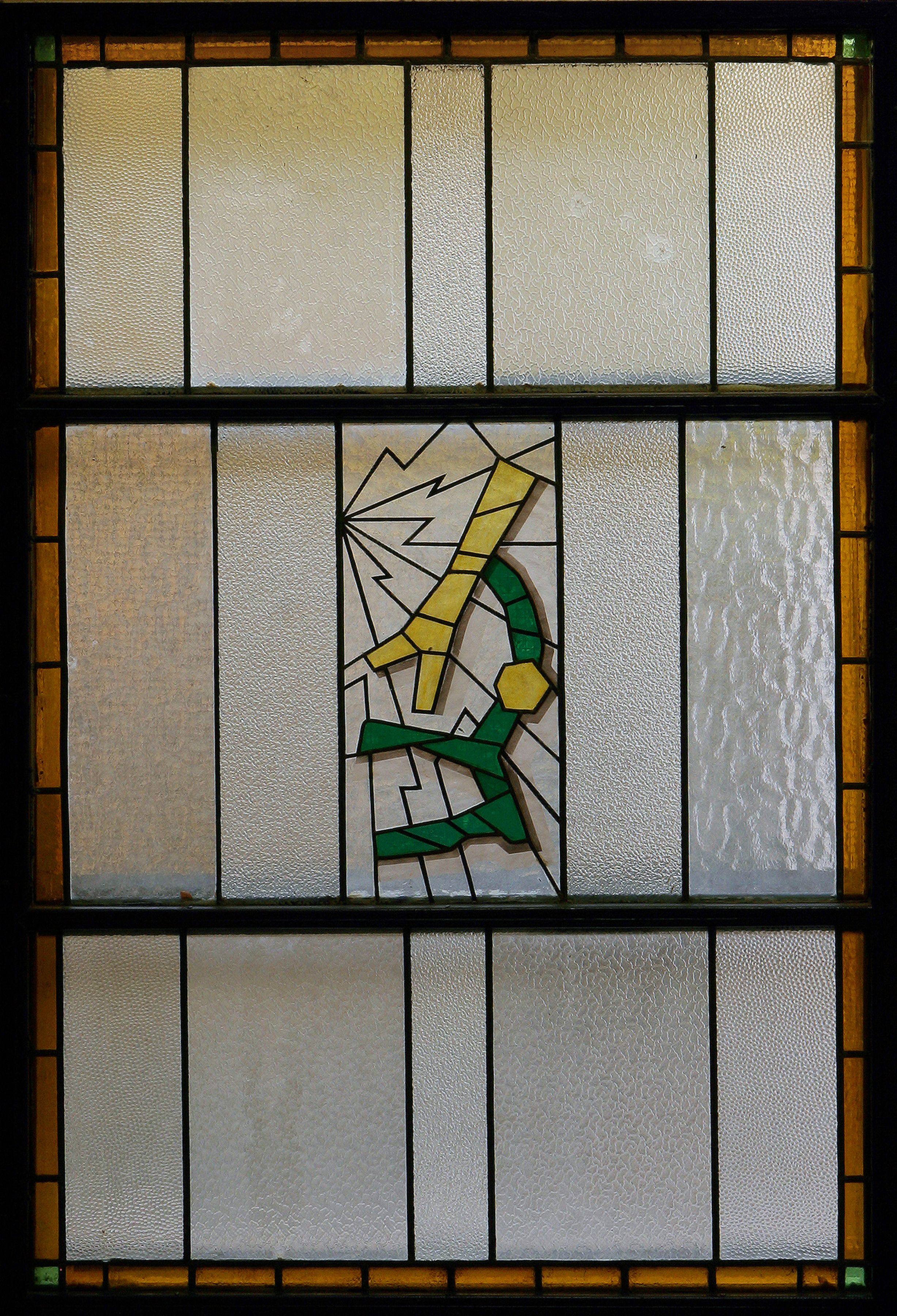 Vidriera compuesta por tres secciones horizontales superpuestas, divididas en piezas rectangulares que alternan vidrios esmerilados de diferentes texturas y, en el recuadro central, el diseño de un microscopio. Las formas redondeadas son sustituidas por líneas rectas negras, propias del emplomado de vidrio, contrastando el cromatismo basado en tonos verde y amarillo del instrumento con el fragmentado fondo blanco. El conjunto se enmarca en una cenefa anaranjada con cuadros verdes en los ángulos.