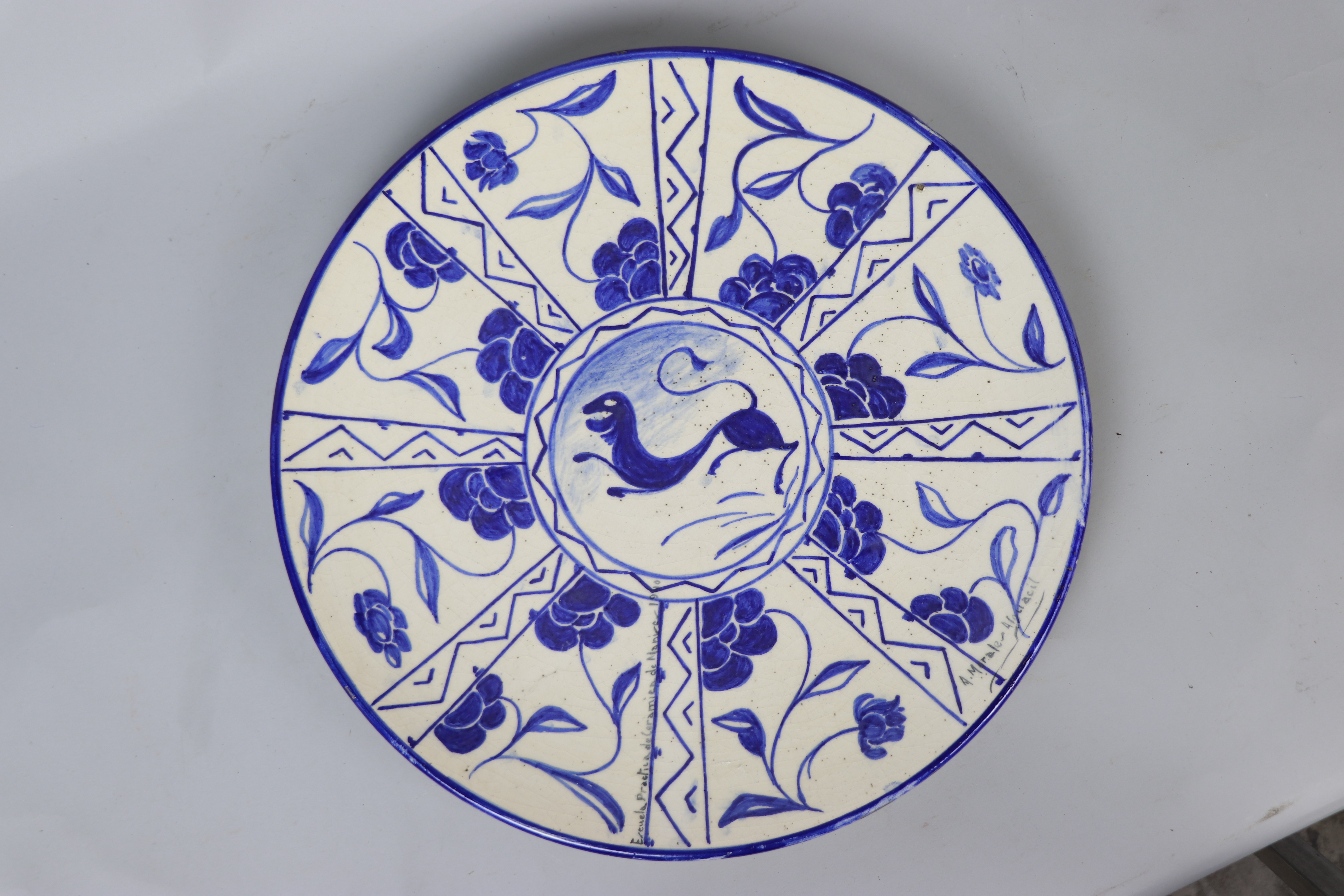 Plato de cerámica modelado en arcilla, torneado en pella y horma y esmaltado en blanco con decoración en azul. Se encuentra dividido mediante bandas rectangulares con marcas triangulares que dan lugar a ocho secciones ornamentadas con motivos florales, las cuales convergen en una esfera central en la que se encuentra representado un león rampante. Es destacable que la figura central sea dicho felino cuya simbología se asocia al sol, y si se observa el plato como un conjunto, se puede apreciar cómo de la esfera del león emanan las bandas rectangulares como si se trataran de los rayos del astro rey, mientras que las flores que lo rodean podrían interpretarse como los planetas que giran a su alrededor.