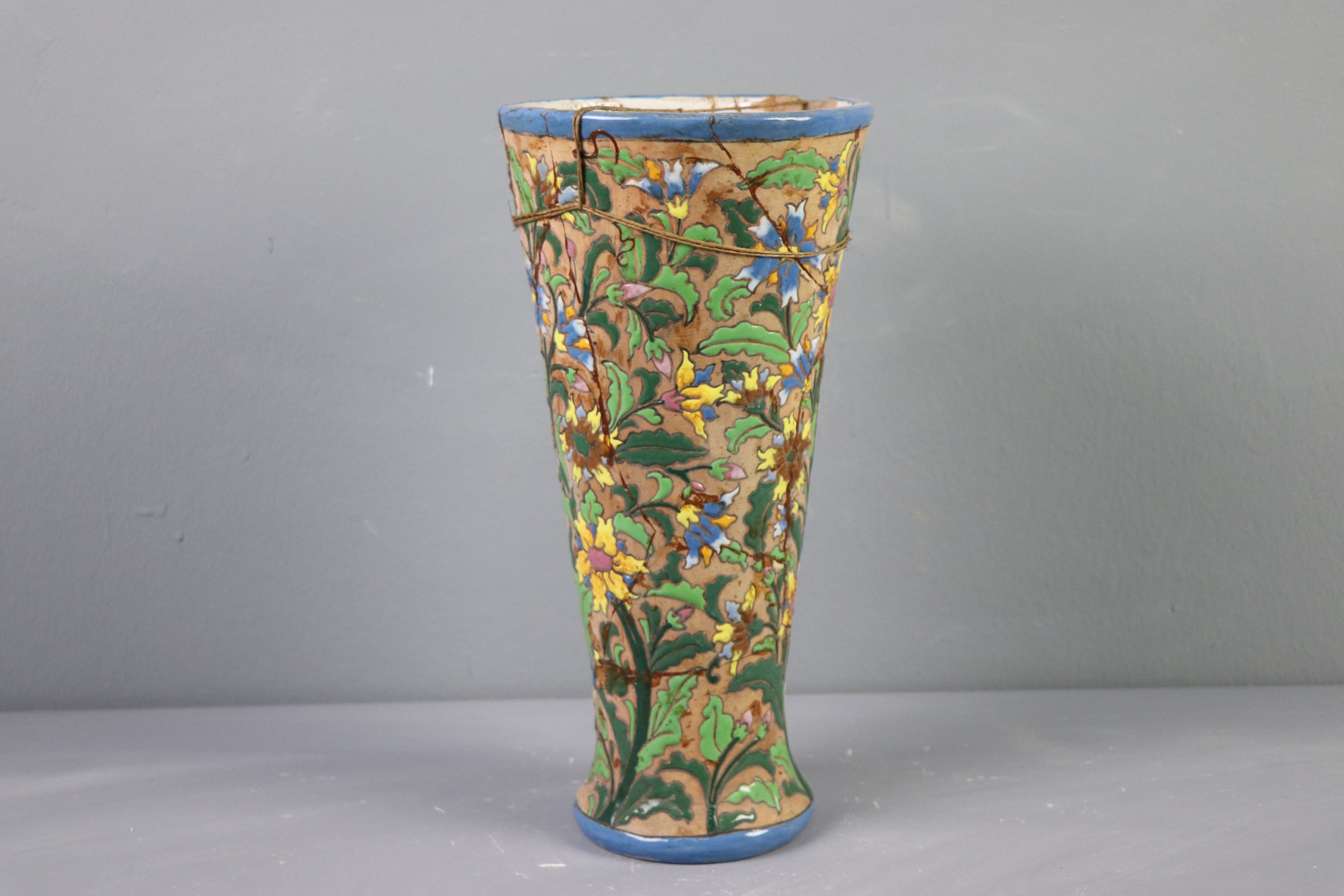 Esta pieza, es un jarrón de cerámica de Manises modelado en arcilla, torneado en pella chica y esmaltado en marrón en el cuerpo y en azul en los bordes. Asimismo, se halla recubierto de una extensa decoración vegetal y floral de colores muy vivos, donde las tonalidades predominantes son el azul y el amarillo para los pétalos y el verde para las hojas.