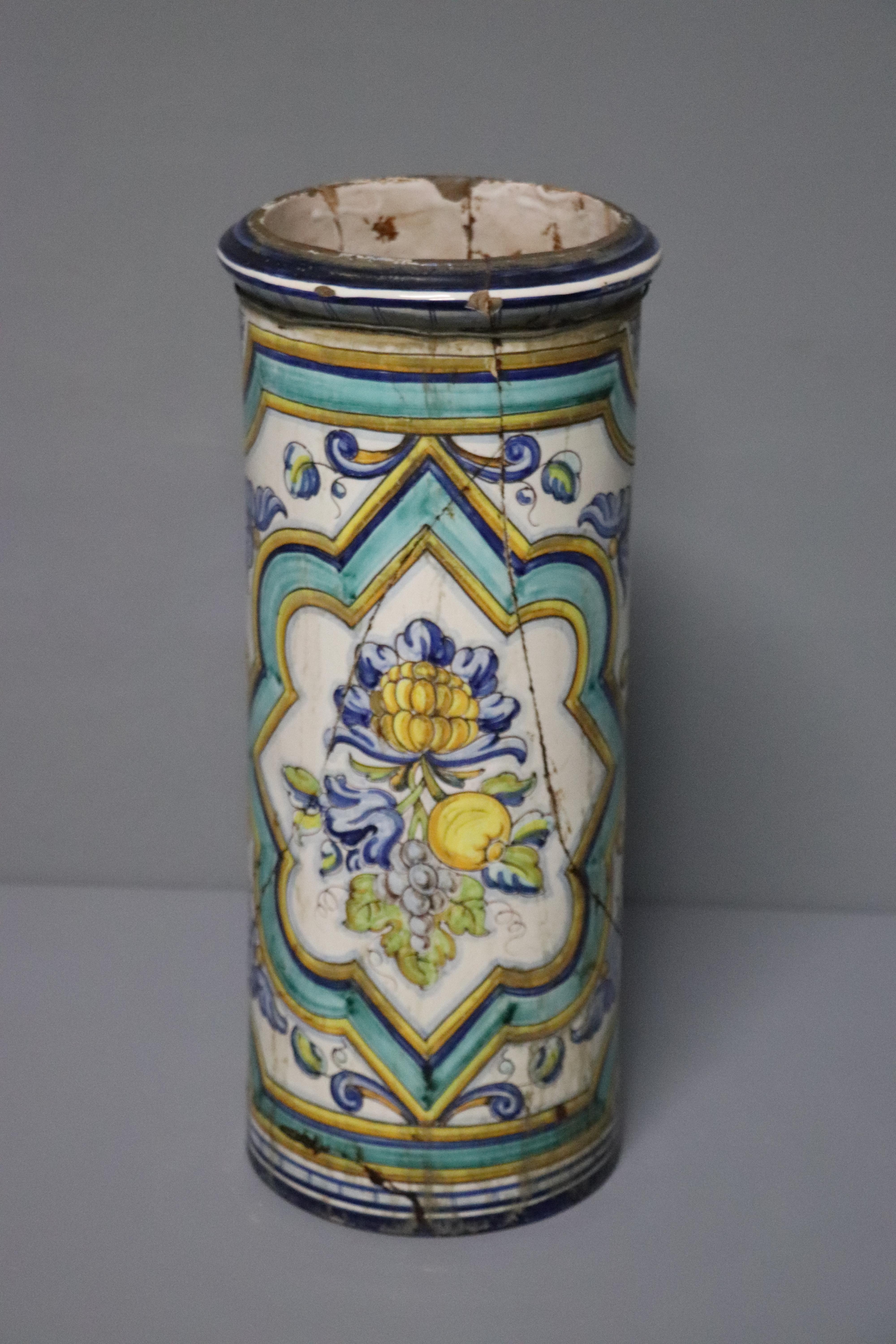 Bastonera en técnica valenciana modelada en arcilla, torneada en pella chica y esmaltada en blanco. El cromatismo de la pieza está protagonizado por verdes, amarillos y azules, siendo estos últimos de intensidad variada.