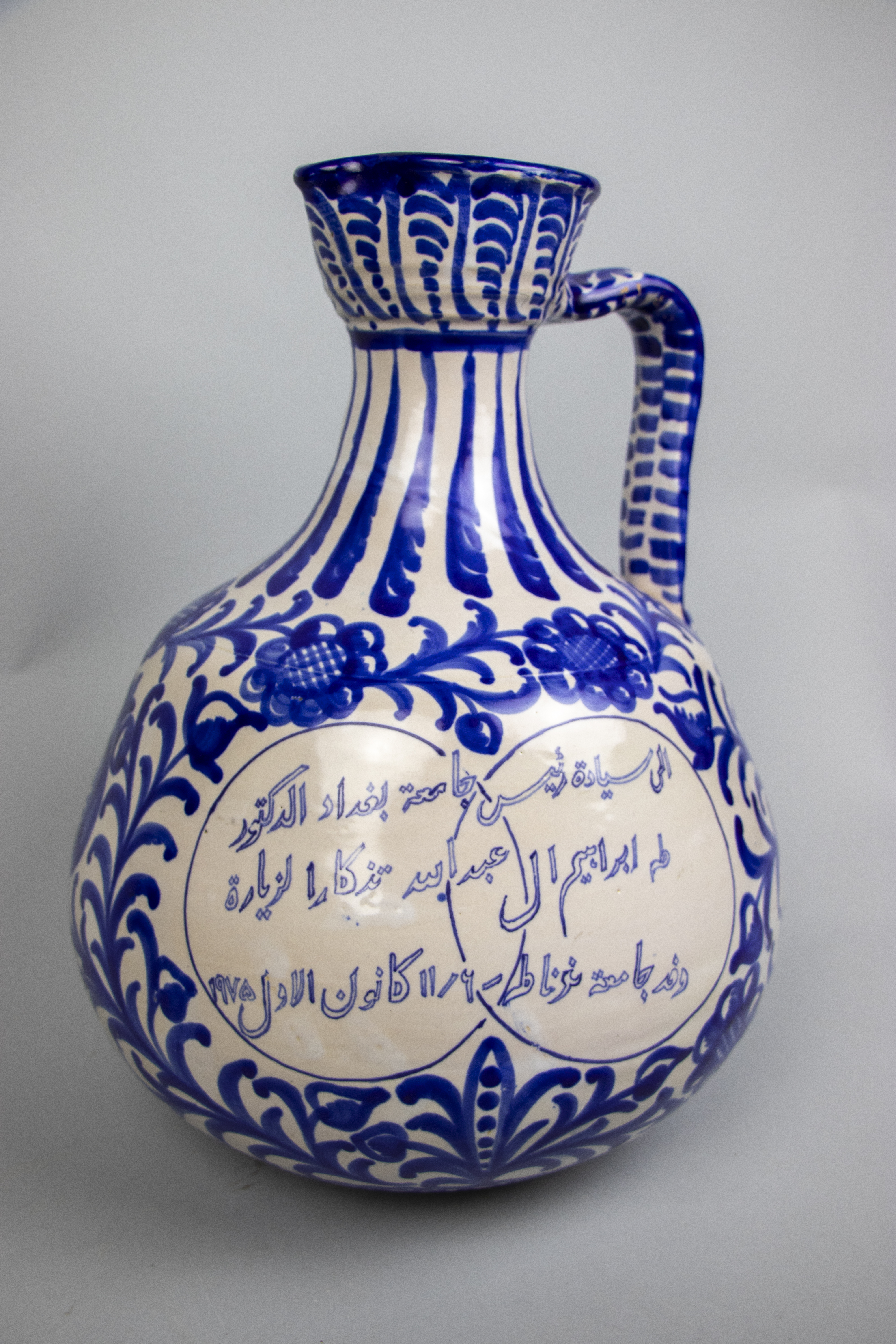 La sección central se decora con una inscripción en caligrafía árabe envuelta en dos círculos rodeados por motivos florales y geométricos típicos de la estética nazarí. El estilizado cuello y la boca de la pieza presentan alternancia de líneas azules y verdes.