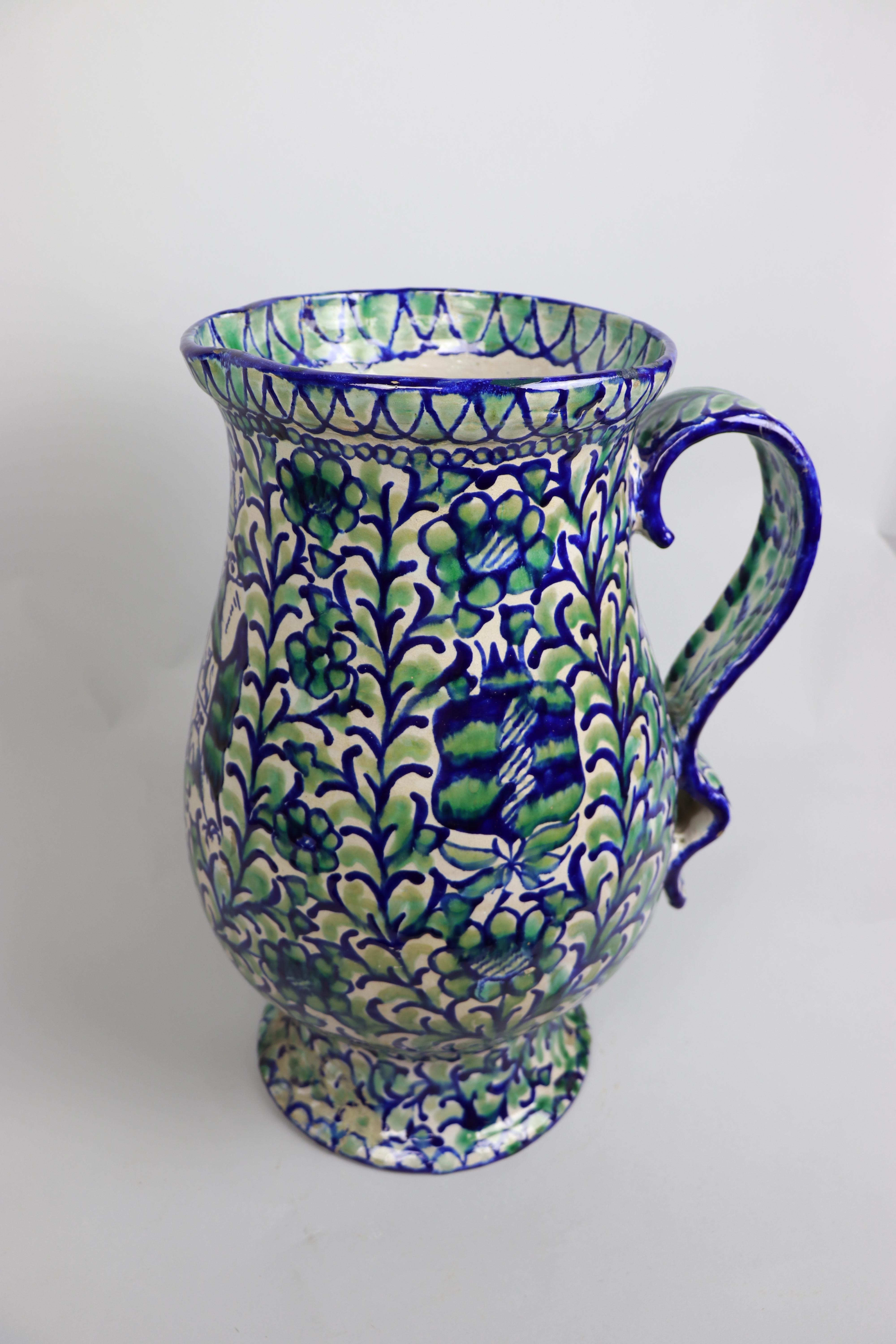 Jarra bastonera de cerámica granadina está modelada en arcilla, torneada en pella chica y esmaltada en blanco con decoración repintada en azul cobalto y verde óxido de cobre.