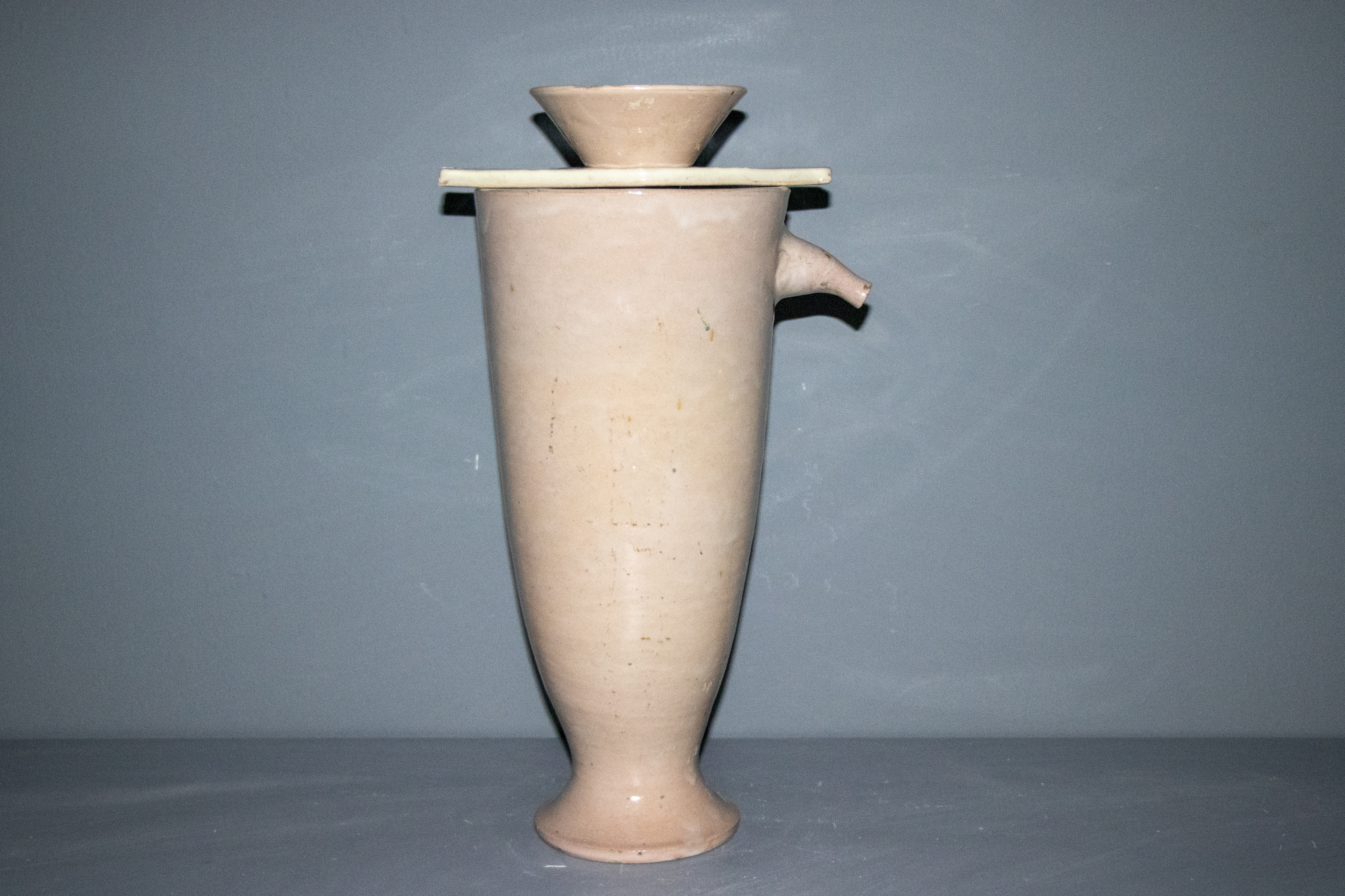 Instrumental de laboratorio realizado en cerámica. La pieza está compuesta por tres partes, ejecutadas a partir del modelado en arcilla, torneadas en pella chica y esmaltadas en blanco rosado. La de mayor tamaño, con forma de copa, cuenta con un pitorro vertedor y una tapadera plana con abertura central en la que se inserta un embudo, también cerámico.