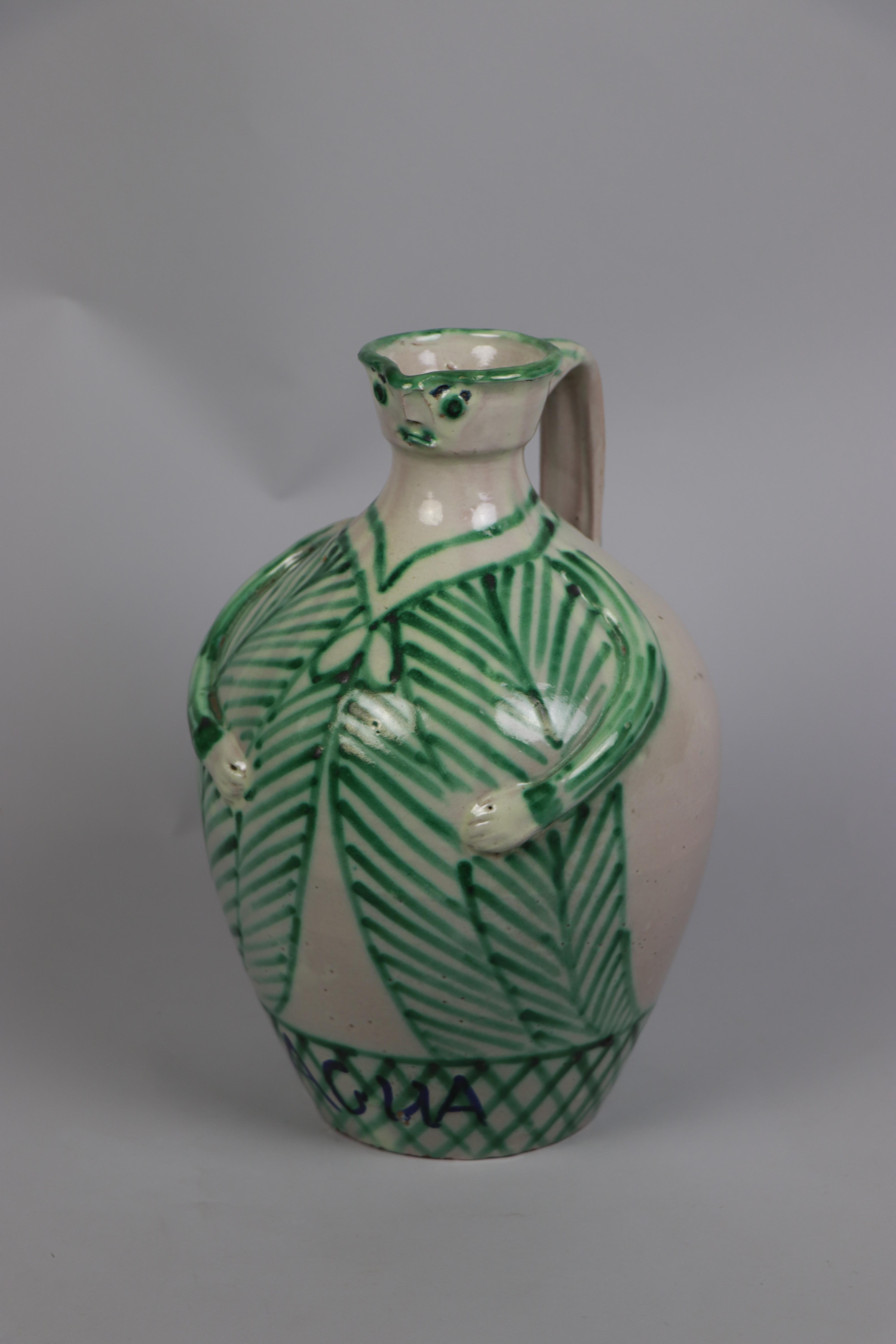 Jarra de cerámica modelada en arcilla, torneada en pella chica, bizcochada y esmaltada en blanco con decoración repintada monocroma en verde. Aprovechando la propia forma de la jarra se le ha dado aspecto antropomórfico, en la boca de la cerámica se ha dibujado la cara y el cuerpo de jarra se ha aprovechado como cuerpo de la figura. La vestimenta se ha realizado en verde y en la parte inferior aparece la palabra "agua".