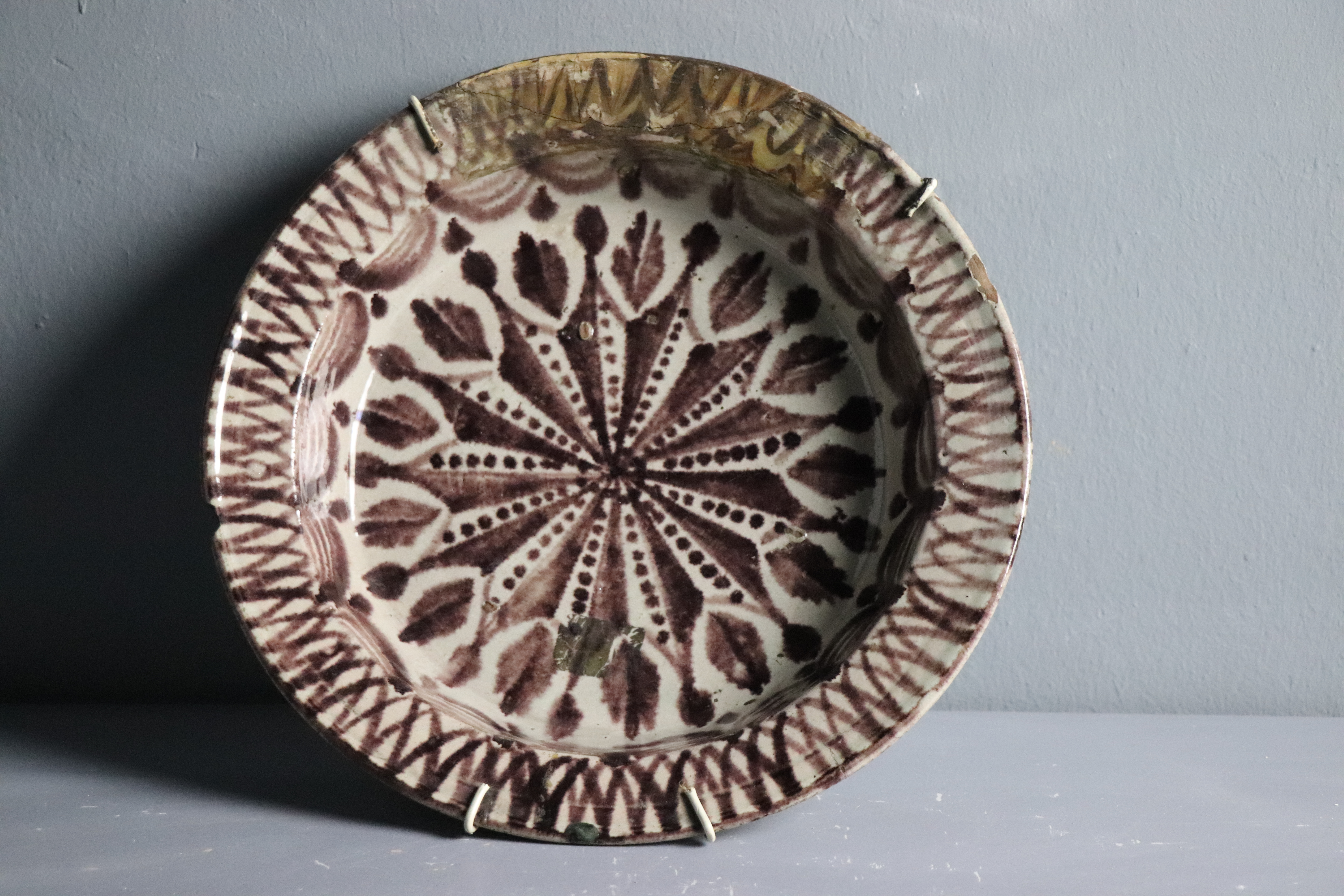 Fuente semillana de cerámica granadina modelada en arcilla, torneada en pella y horma y esmaltada en blanco con decoración corriente monocroma en marrón realizada a partir de óxido de manganeso.
