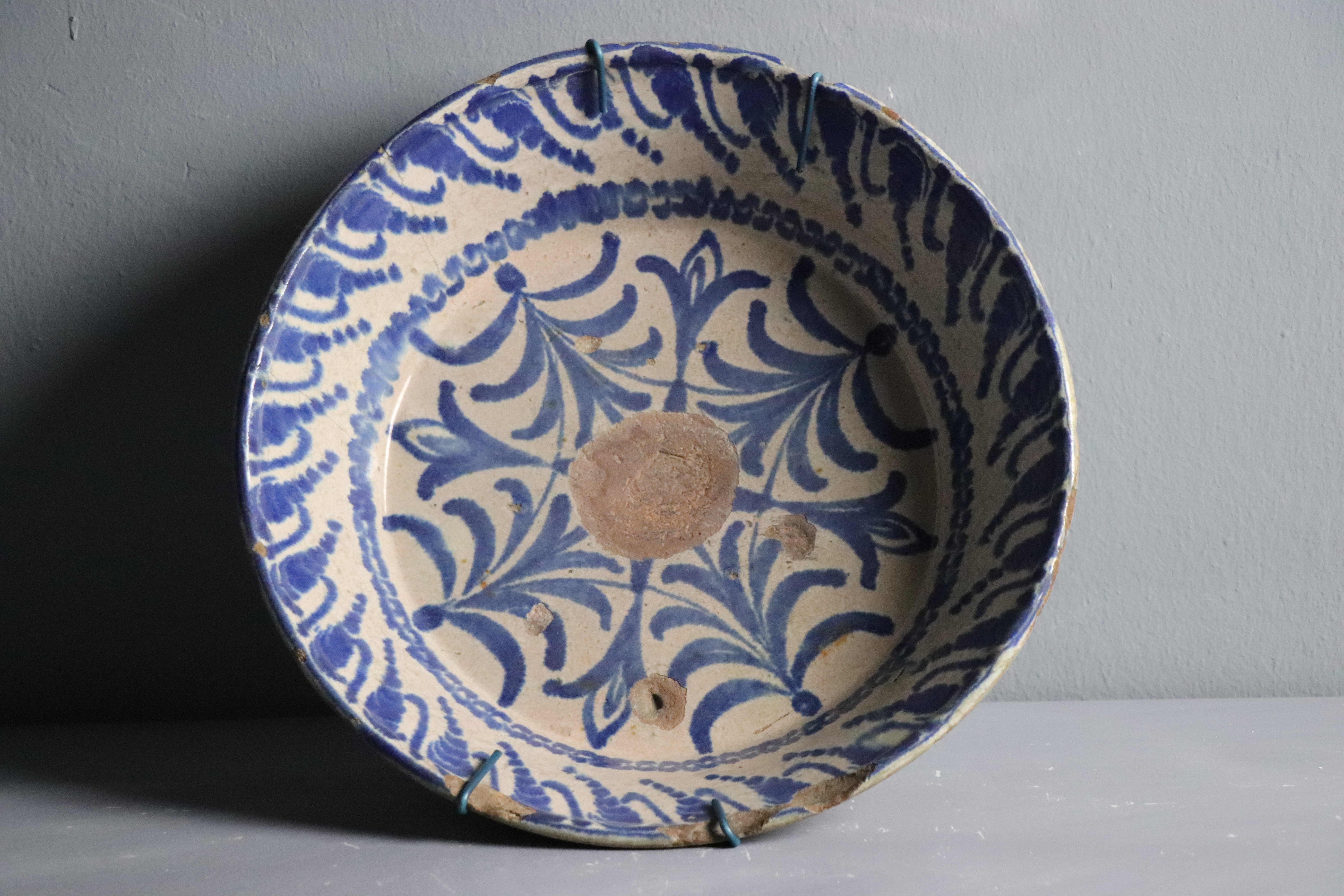 Fuente semillana de cerámica granadina modelada en arcilla, torneada en pella y horma y esmaltada en blanco con decoración monocroma en azul cobalto.