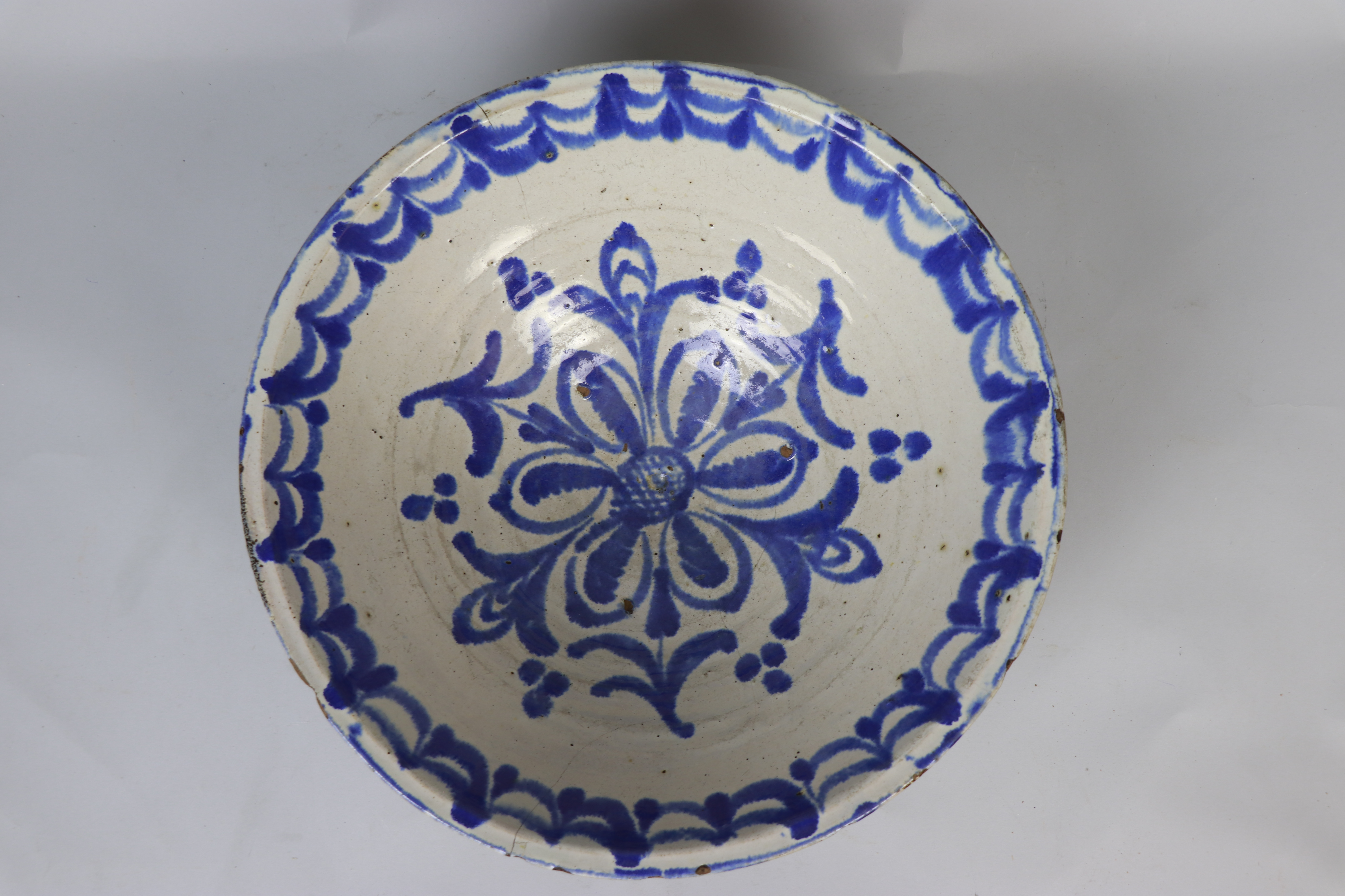 Tazón de cerámica granadina modelado en arcilla, torneado en pella y horma y esmaltado en blanco con decoración corriente monocroma en azul cobalto.