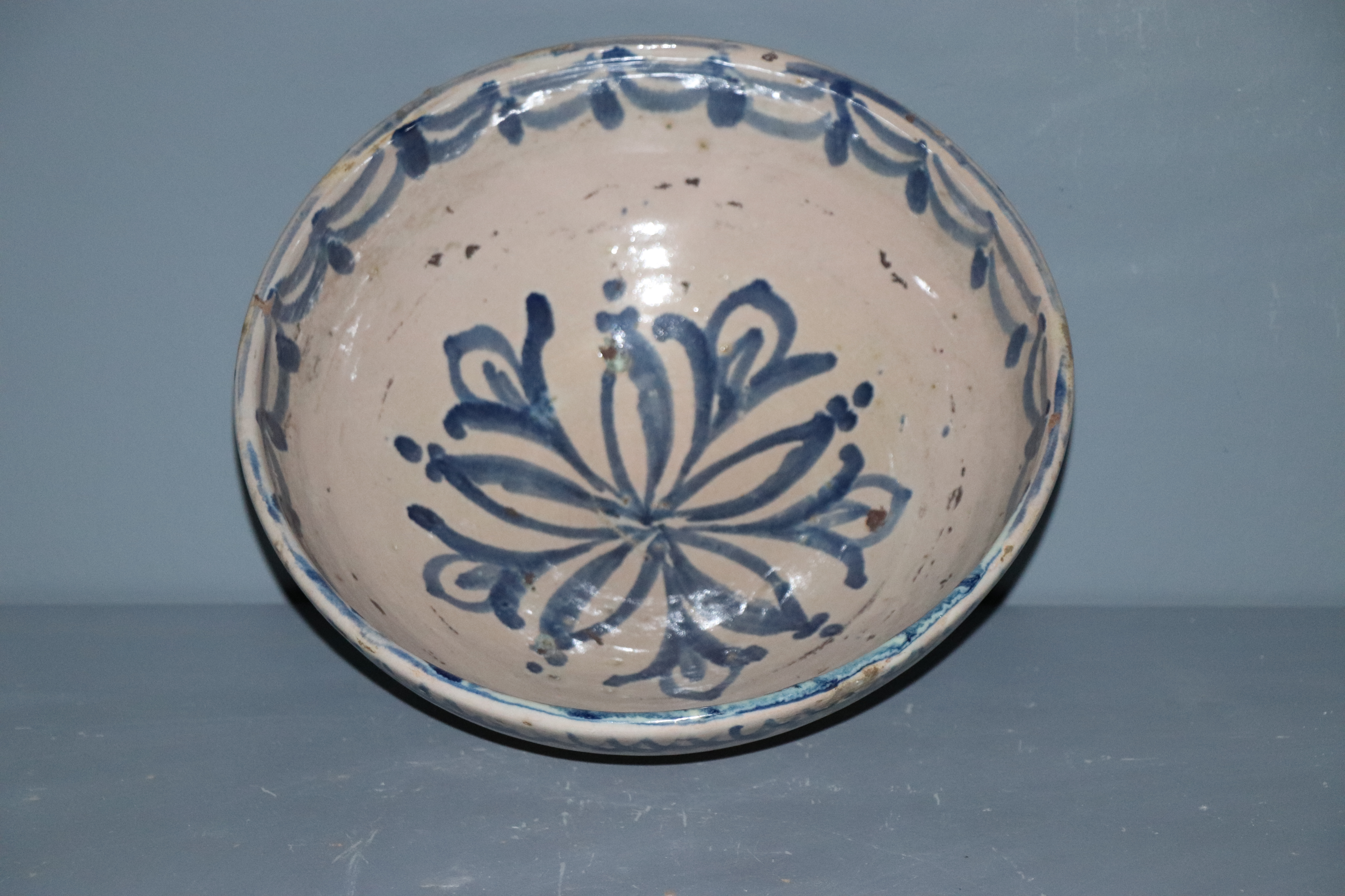 Tazón de cerámica granadina modelado en arcilla, torneado en pella y horma y esmaltado en blanco con decoración repintada monocroma en azul cobalto. En el borde presenta una cenefa formada por figuras convexas a modo de guirnalda, mientras que en el interior se despliega un sencillo motivo floral de cuyos ángulos irradian cinco flores similares a las del granado.
