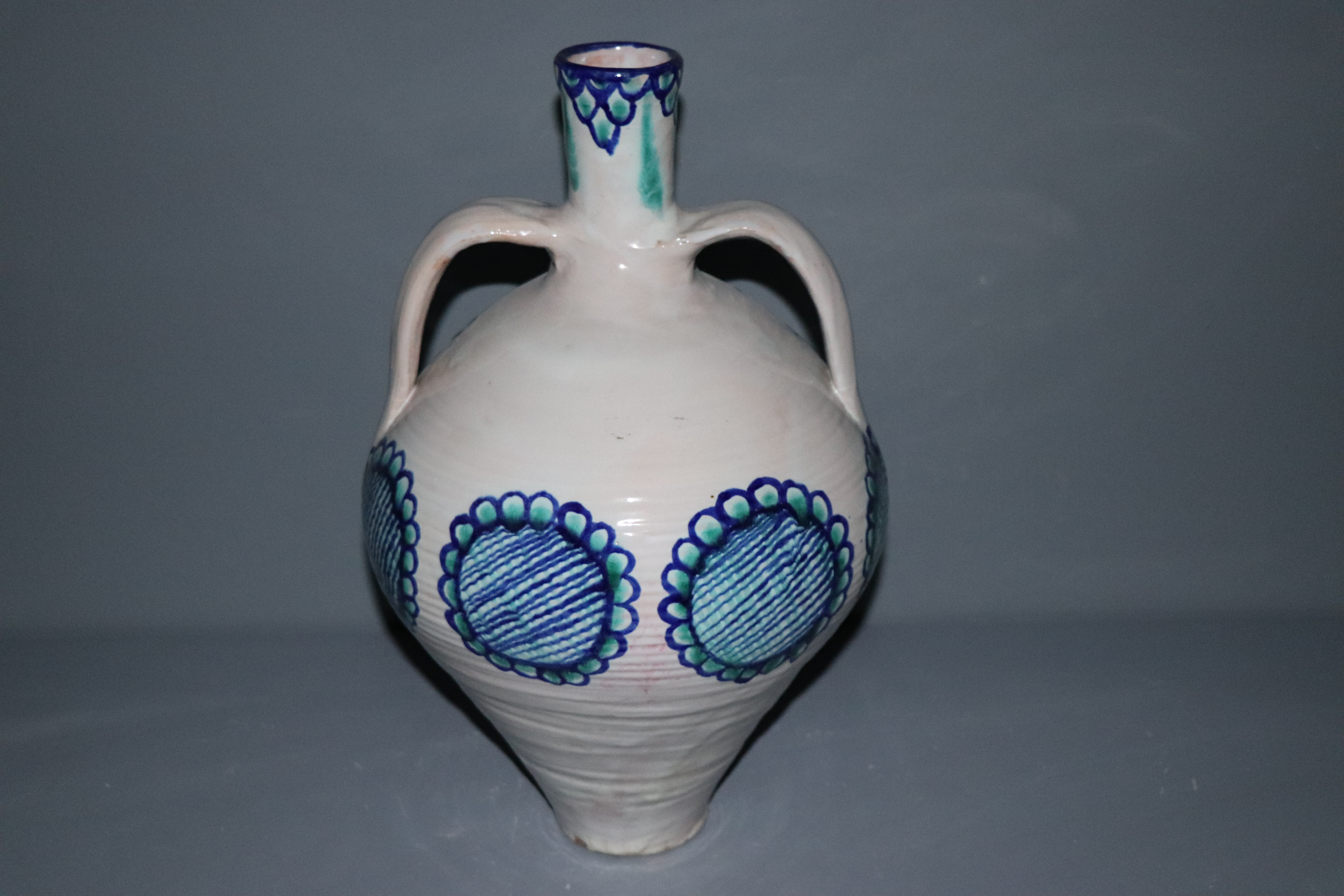 Cántaro de dos asas. Pieza de cerámica granadina inspirada en los denominados “cántaros de Guadix”, modelada en arcilla, torneada en pella chica y esmaltada en blanco con decoración repintada en azul cobalto y verde óxido de cobre.