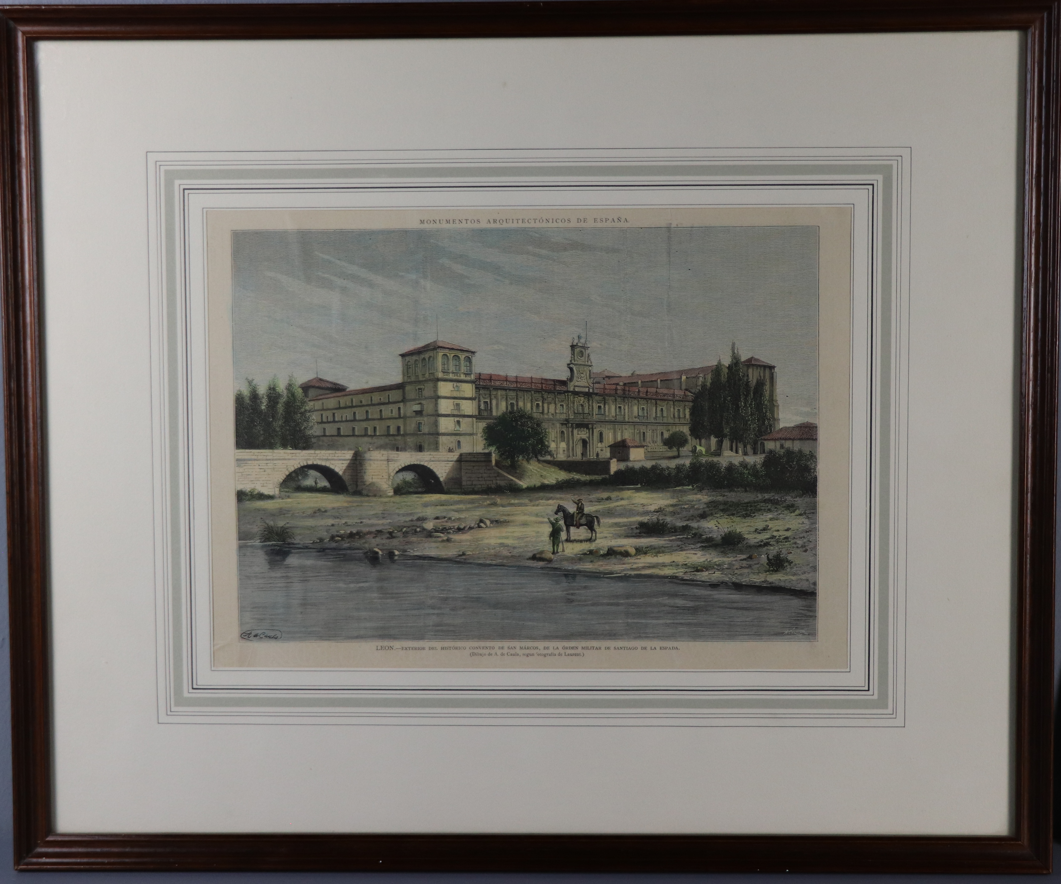 Representa el exterior del Convento de San Marcos de León y en primer término el puente sobre el río Bernesga con dos personajes, uno de ellos a caballo.