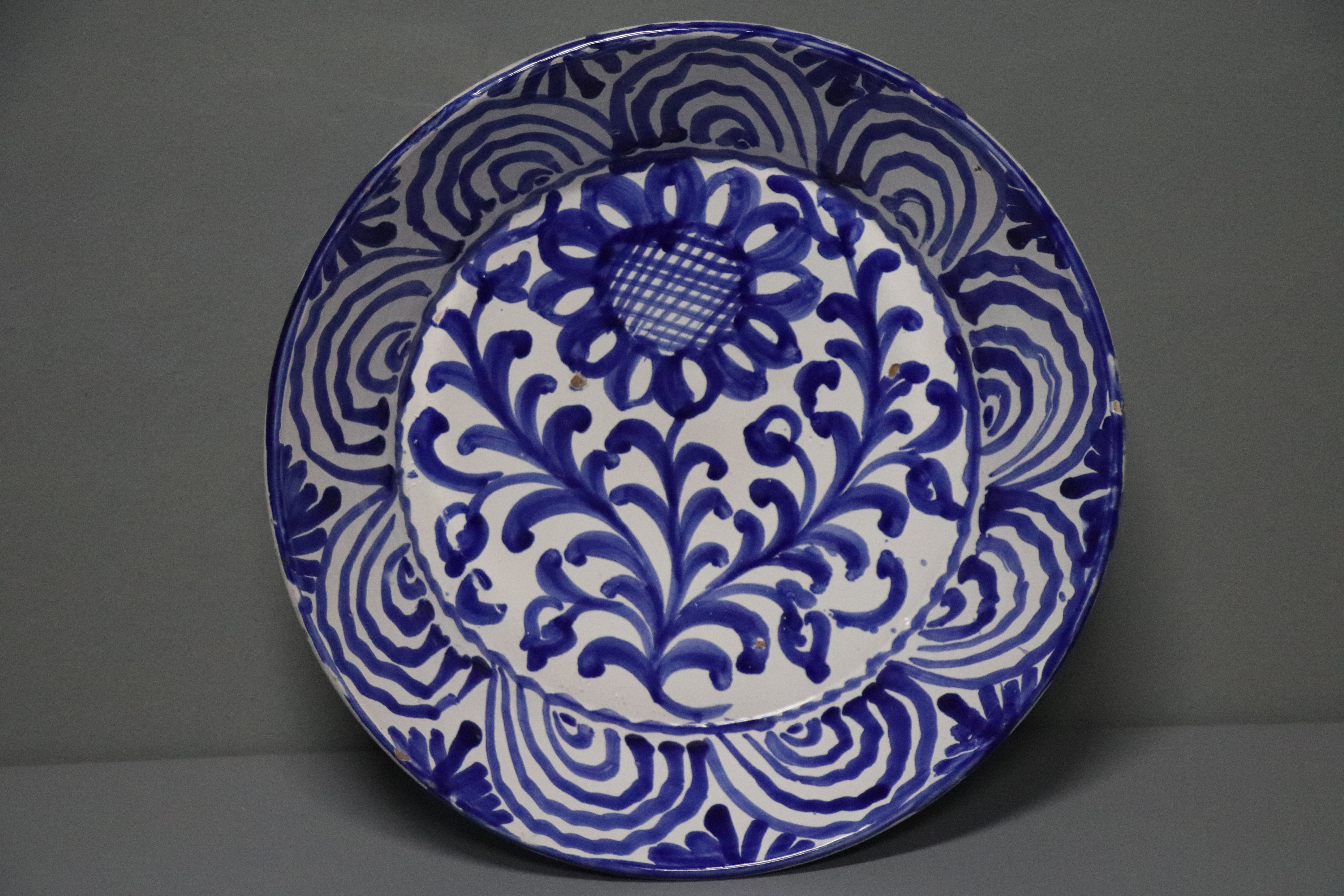 Fuente semillana de cerámica granadina modelada en arcilla, torneada en pella y horma y esmaltada en blanco con decoración repintada monocroma en azul cobalto.