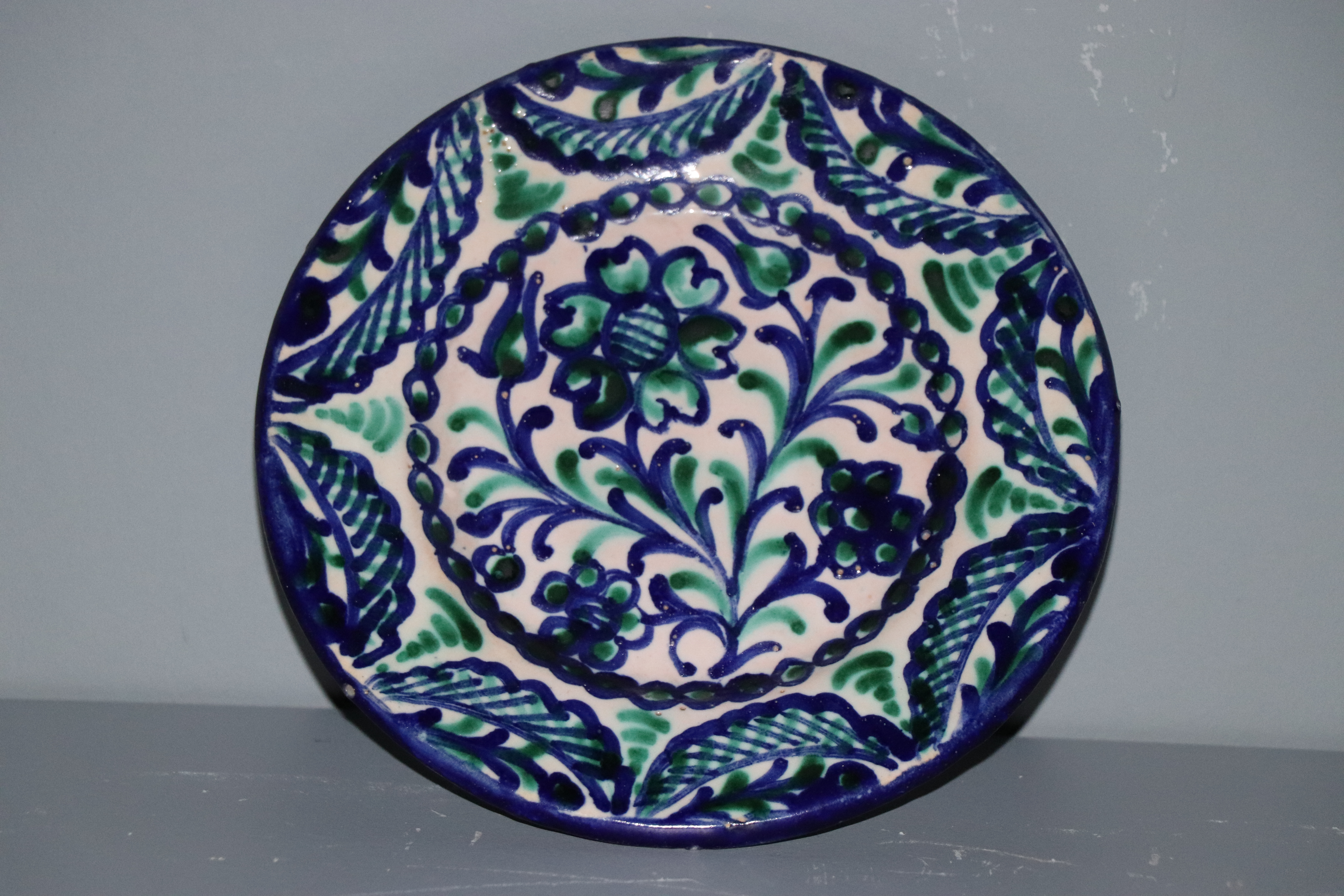 Plato de cerámica granadina modelado en arcilla, torneado en pella y horma y esmaltado en blanco con decoración repintada en azul cobalto y verde de óxido de cobre.