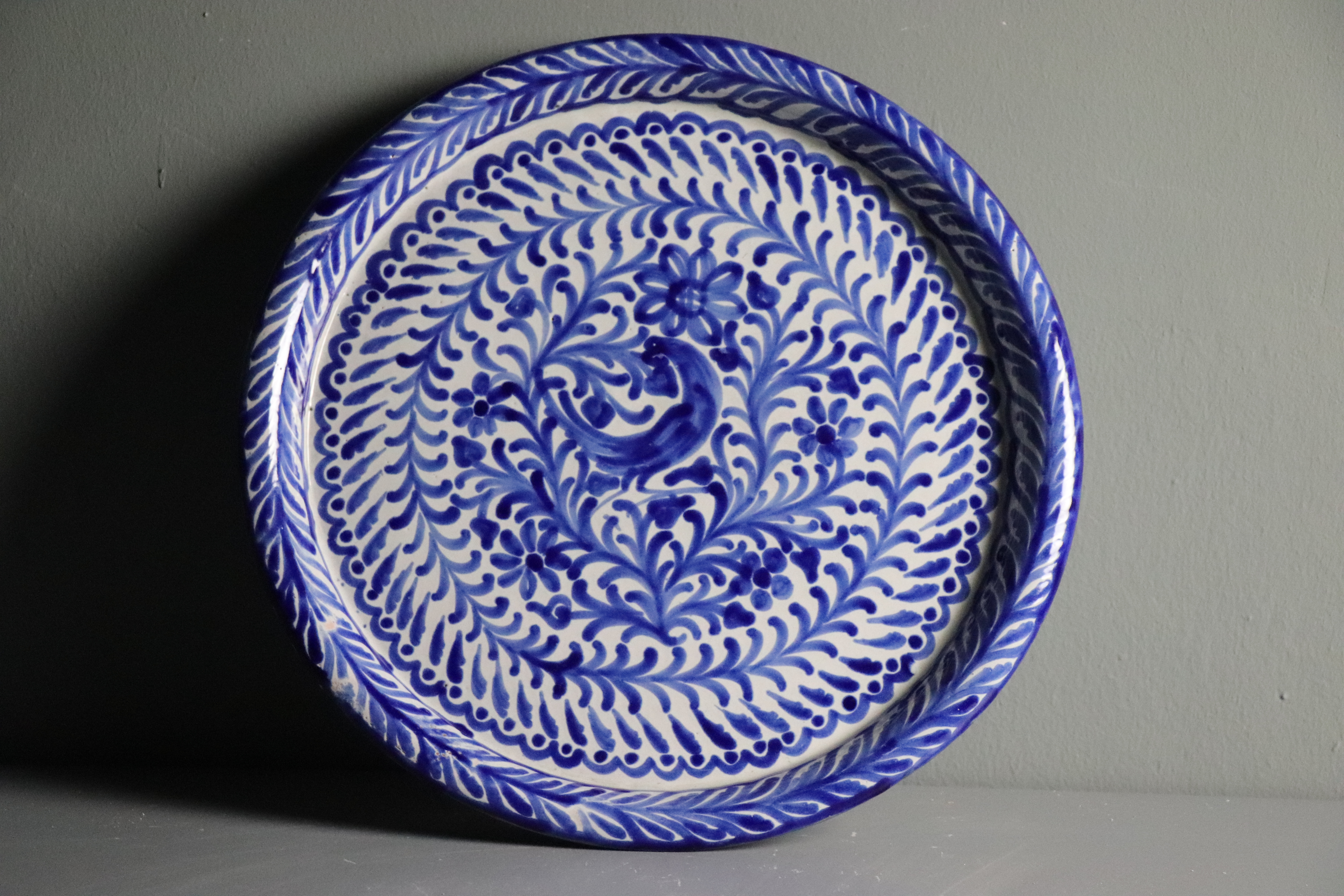 Bandeja de cerámica granadina modelada en arcilla, torneada en pella y horma y esmaltada en blanco con decoración repintada monocroma en azul cobalto.