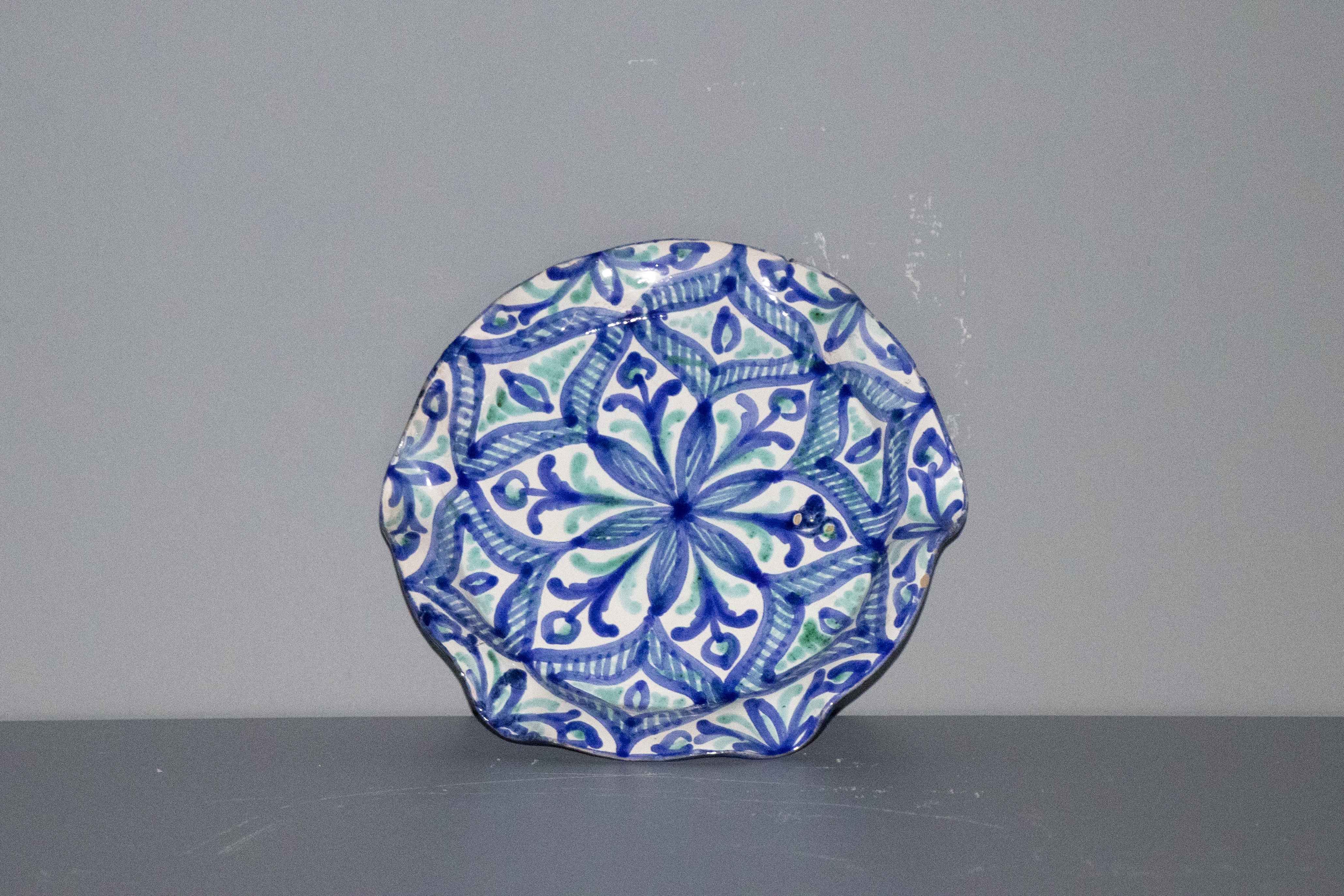 Cenicero de cerámica granadina modelado en arcilla, torneado en pella y horma y esmaltado en blanco con decoración repintada en azul cobalto y verde óxido de cobre.