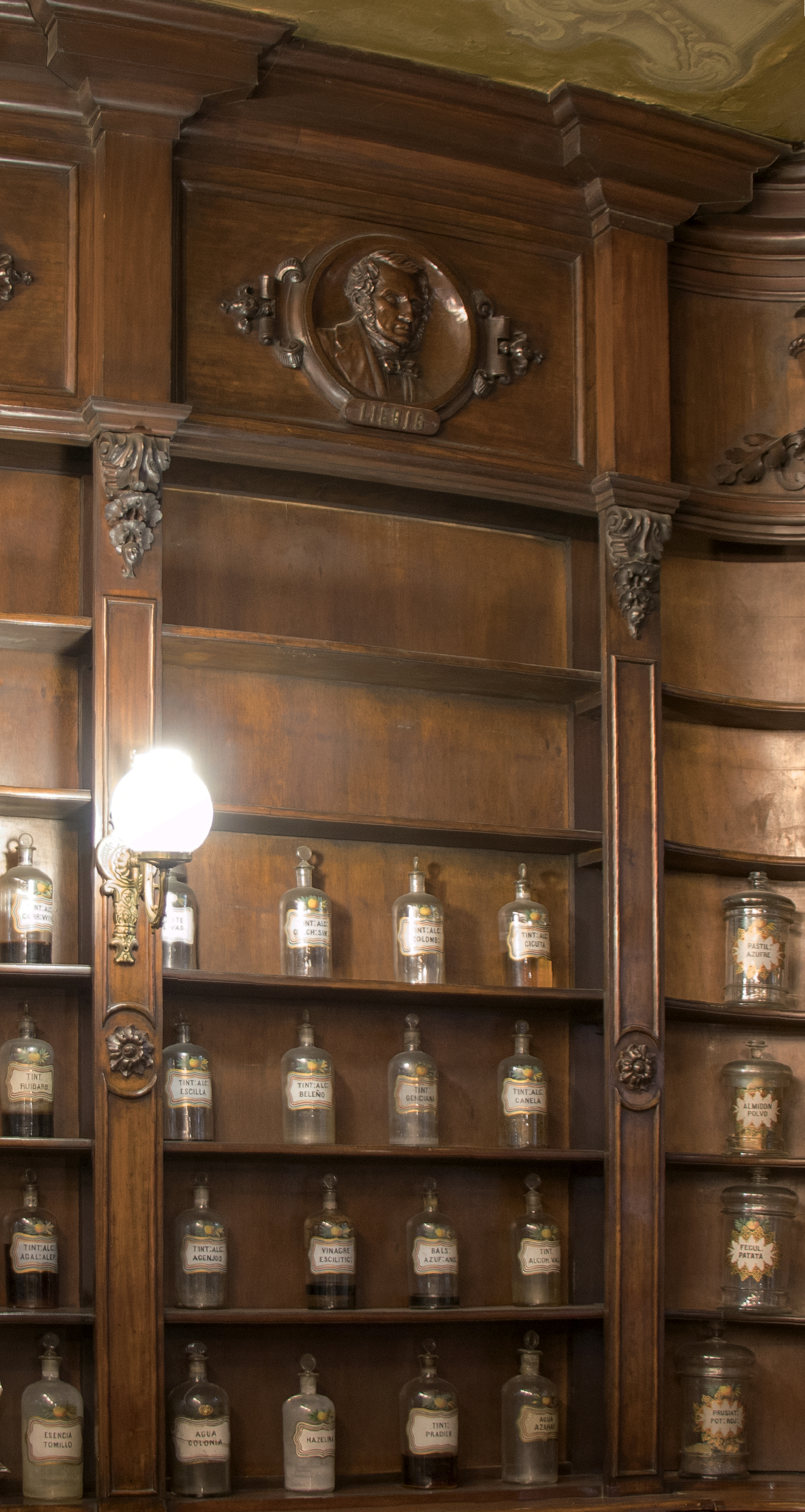 En altura, la estantería se articula en tres partes: un módulo inferior de cajones, algo más sobresaliente que el resto; un segundo bloque, el mayor de los tres, abierto, con seis baldas donde se dispone parte del botamen de la farmacia, y un friso superior flanqueado por pilastras en cuyo centro aparece tallado el retrato del químico alemán Justus von Liebig (1803-1873), uno de los pioneros en el estudio de la química orgánica cuyos principios aplicó en los campos de la  biología y la agricultura. El retrato está enmarcado en un tondo circular con decoraciones a ambos lados que adaptan el círculo al paño rectangular e identificado por una cartela tallada con las letras en dorado donde se puede leer "LIEBIG".