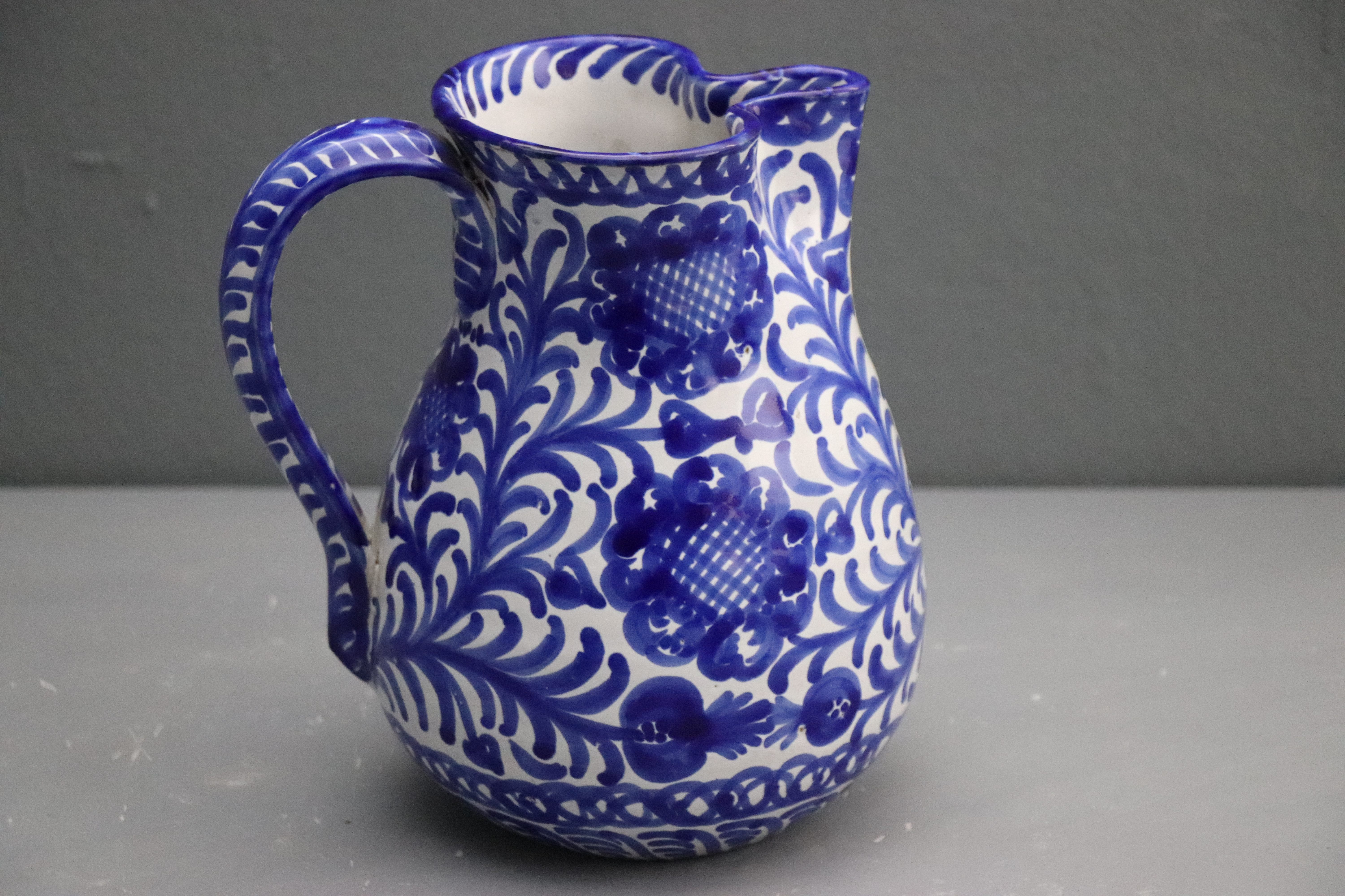 Jarra de sangría de cerámica granadina modelada en arcilla, torneada en pella chica y esmalta en blanco con decoración repintada monocroma en azul cobalto.