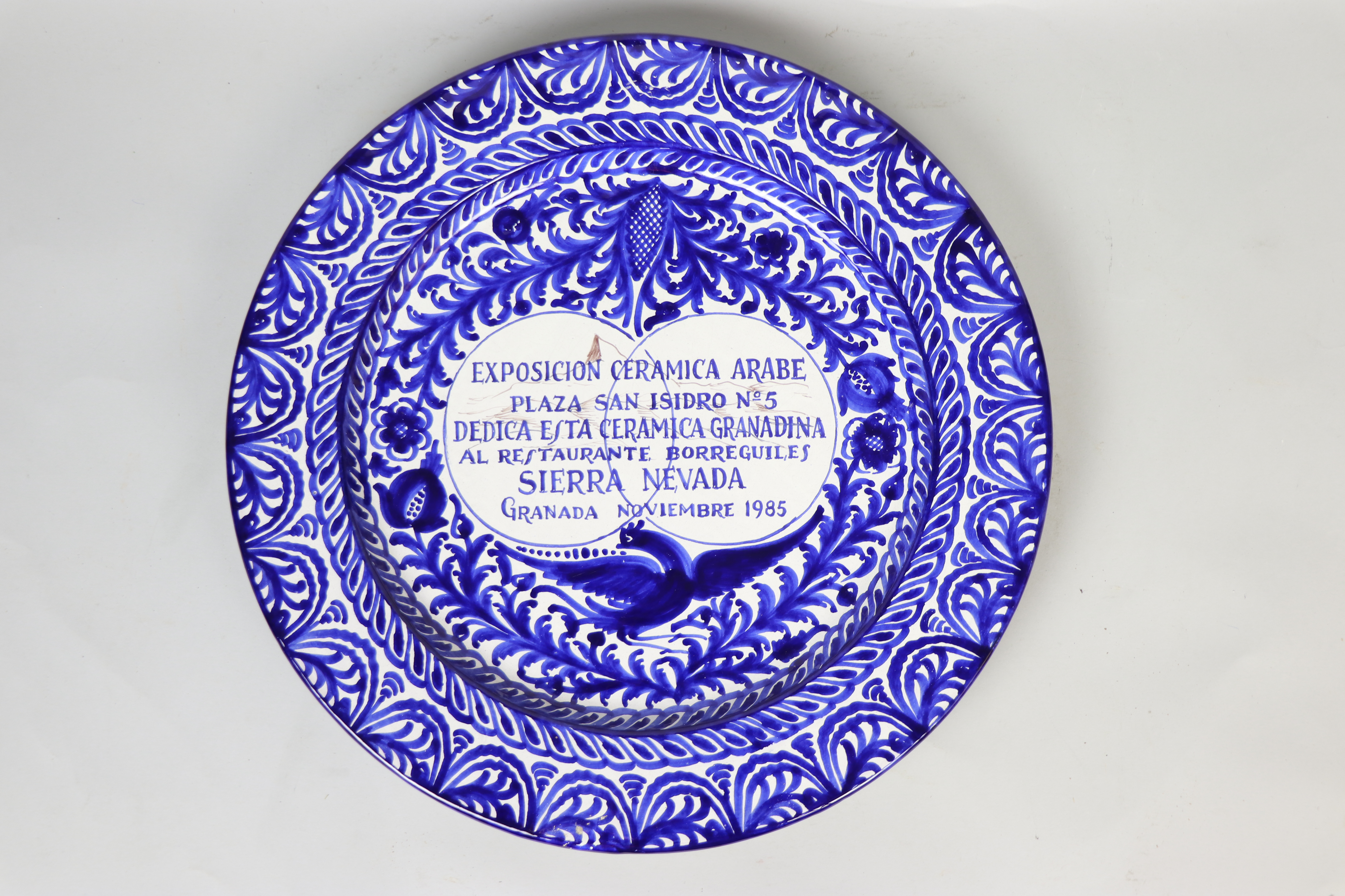 Tal y como señala la inscripción, este plato fue realizado en la Fábrica de Cerámica San Isidro de Granada en 1985 como un regalo para el restaurante Borreguiles de Sierra Nevada.
