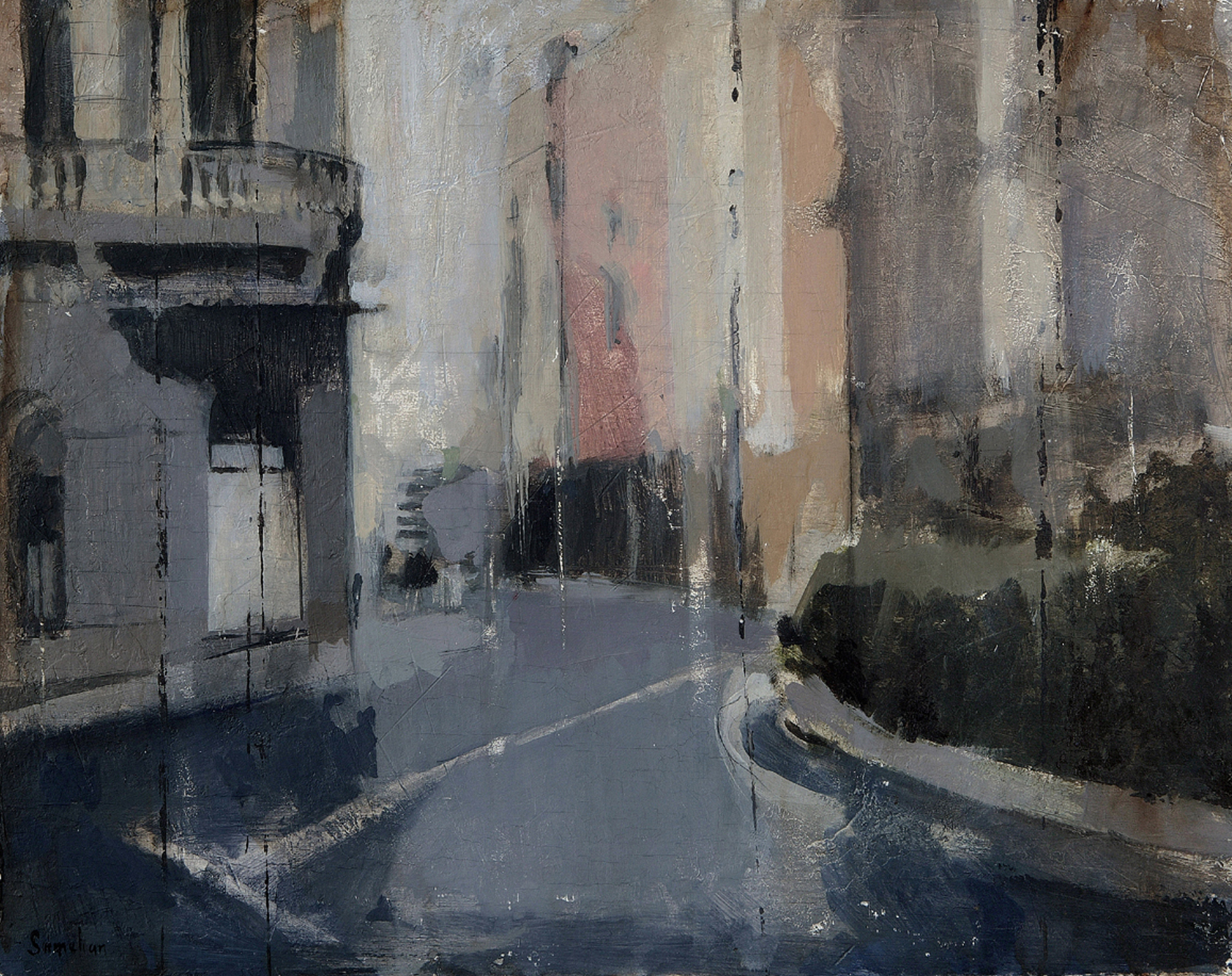 Paisaje urbano pintado con amplias manchas de colores apagados que crean una imágen desvaída. Domina lla verticalidad de los trazos que, junto a los reflejos en el pavimento, transmiten una sensación lluviosa. El primer plano, en el que vemos dos edificios, es los más oscuro y angosto, y enmarcan una zona central más luminosa y menos definida, que intuímos puede conectar con un espacio más amplio.
