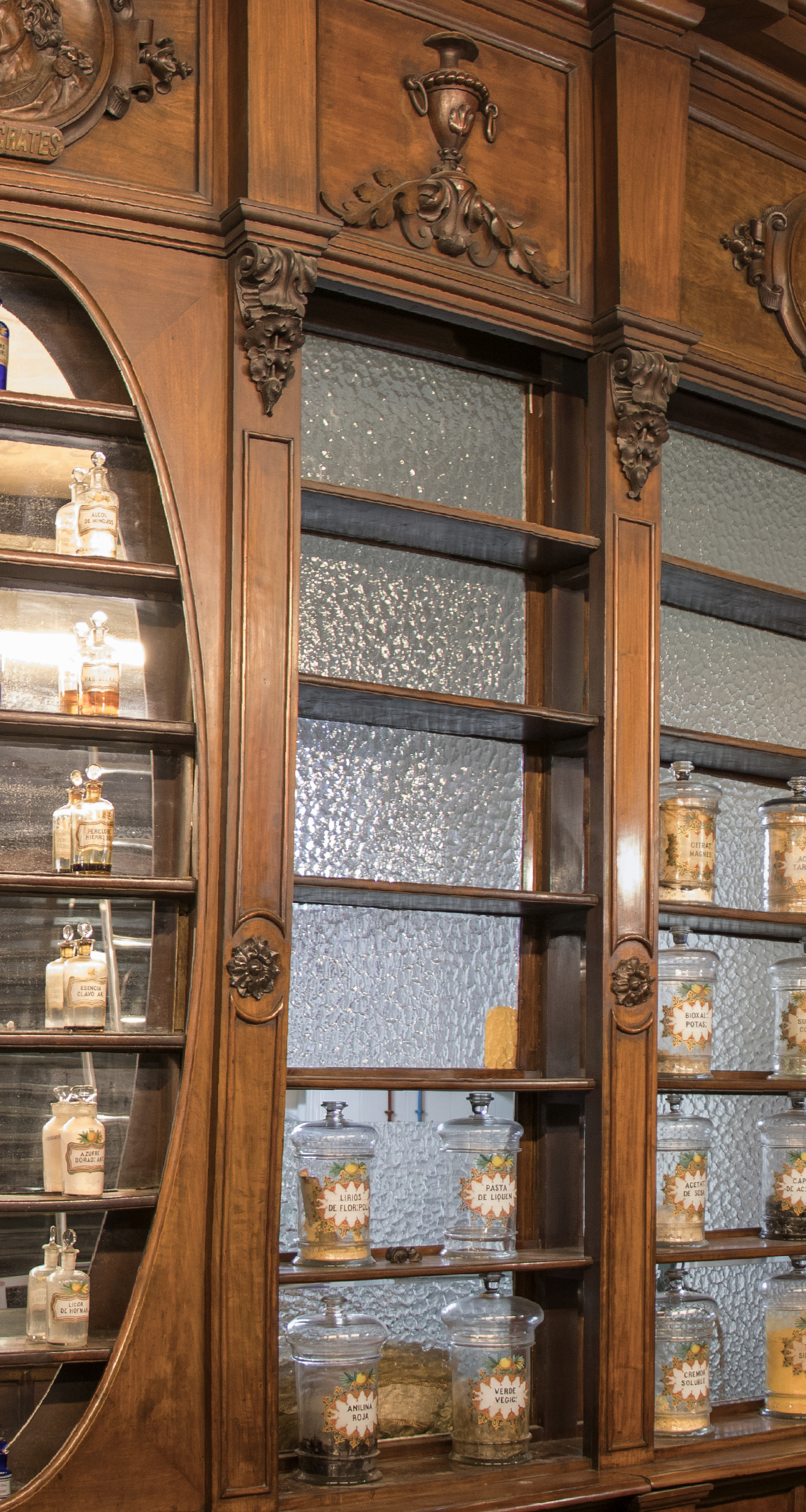 En altura, la estantería se articula en tres partes: un módulo inferior de cajones, algo más sobresaliente que el resto; un segundo bloque, el mayor de los tres, abierto, con seis baldas donde se dispone parte del botamen de la farmacia, y un friso superior flanqueado por pilastras en cuyo centro aparece tallado un ornamento vegetal rematado por una copa con tapa y asas.