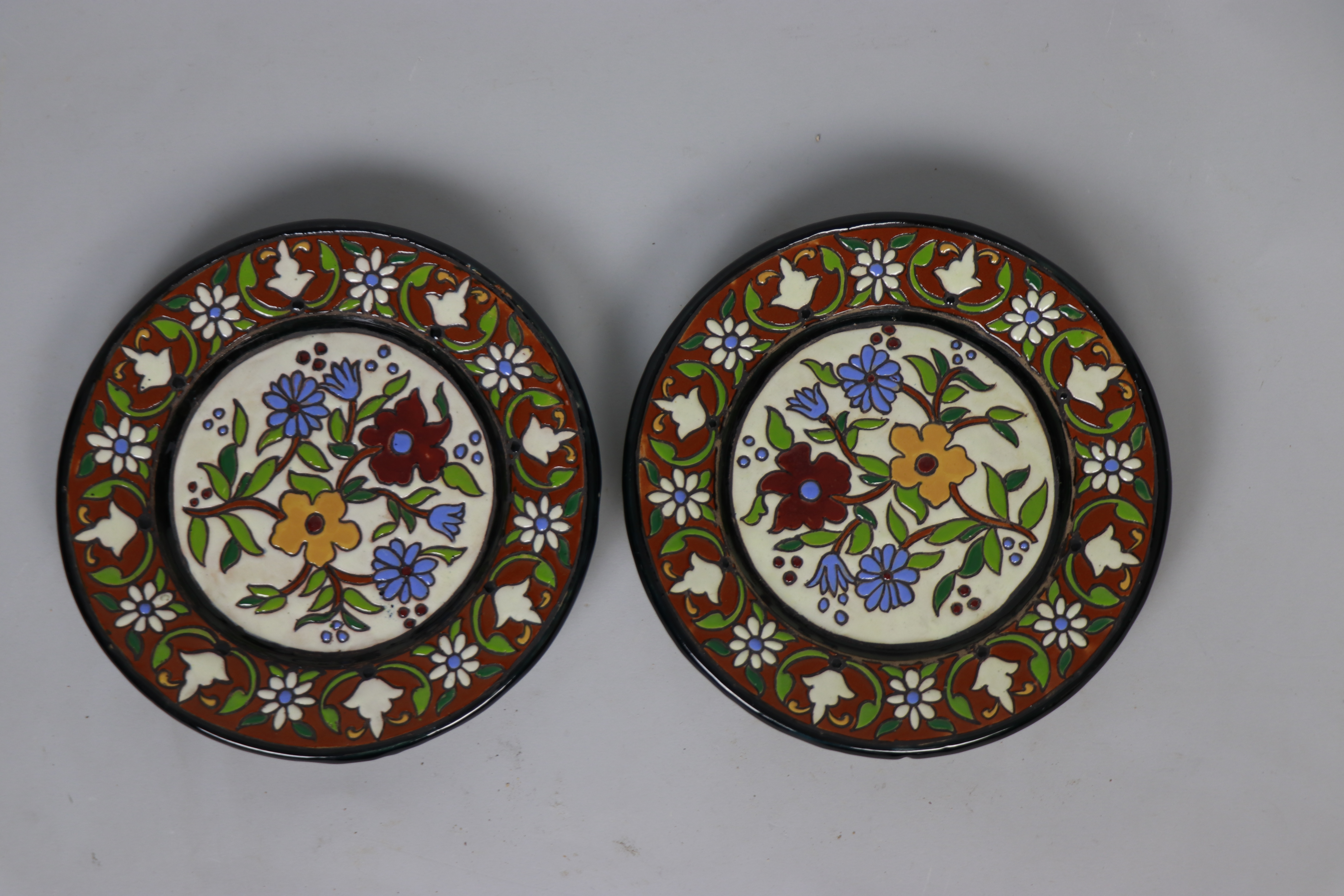Dos platos gemelos modelados en arcilla, torneado en pella y horma y esmaltados en cuerda seca. La ornamentación reproduce en ambos un esquema decorativo vegetal en la torta donde, sobre fondo blanco, se entremezclan tres flores y sus tallos, mientras que en el ala, se inscriben motivos vegetales y florales sobre un fondo marrón rojizo aplicado a partir de óxido de hierro.