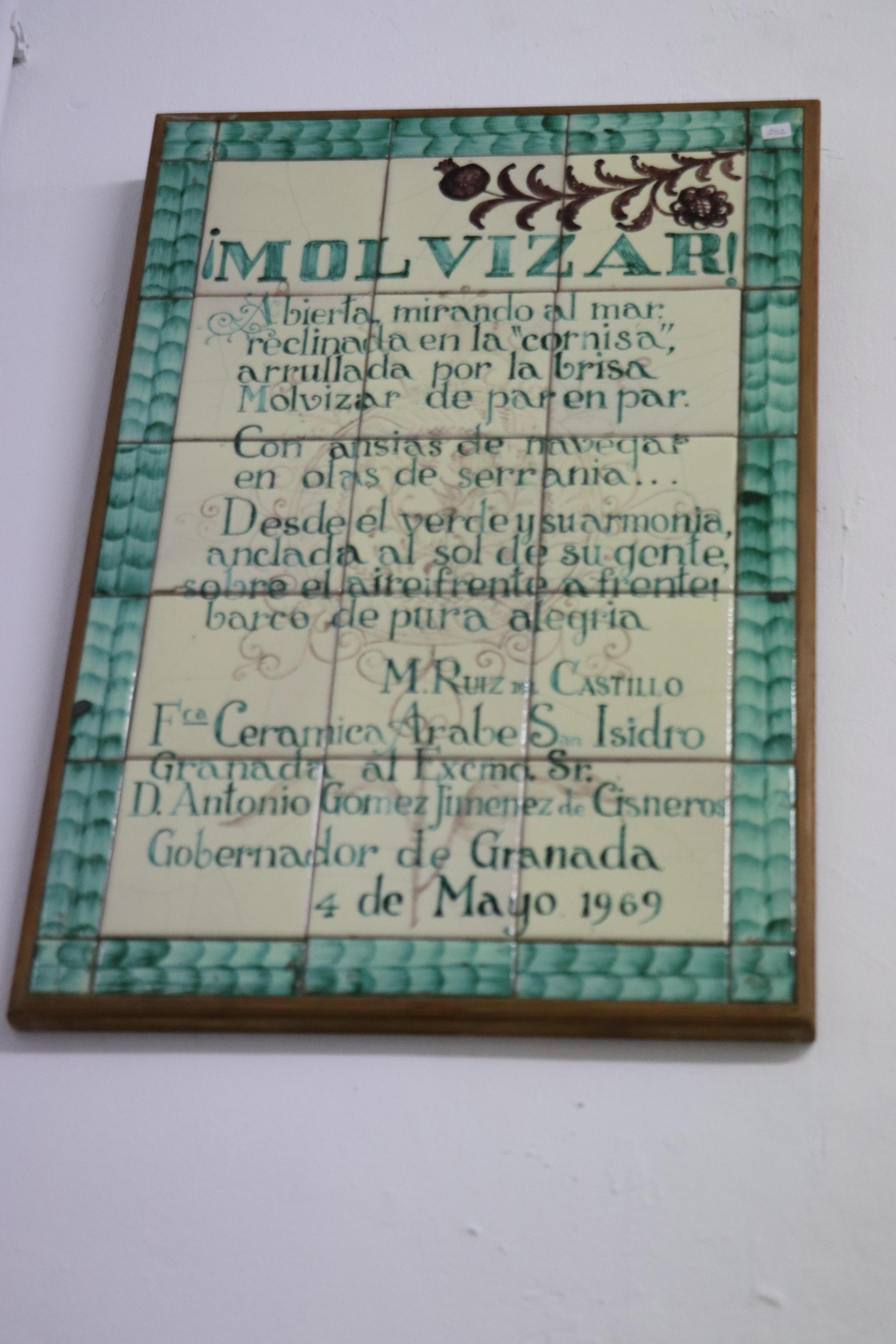 Paño de azulejos modelado en arcilla y esmaltado en blanco con decoración repintada en verde óxido de cobre y un motivo vegetal con girasol y granada en marrón óxido de hierro. Asimismo, cuenta con un poema de Manuel Ruiz del Castillo a modo de laudatio a la localidad granadina de Molvízar: