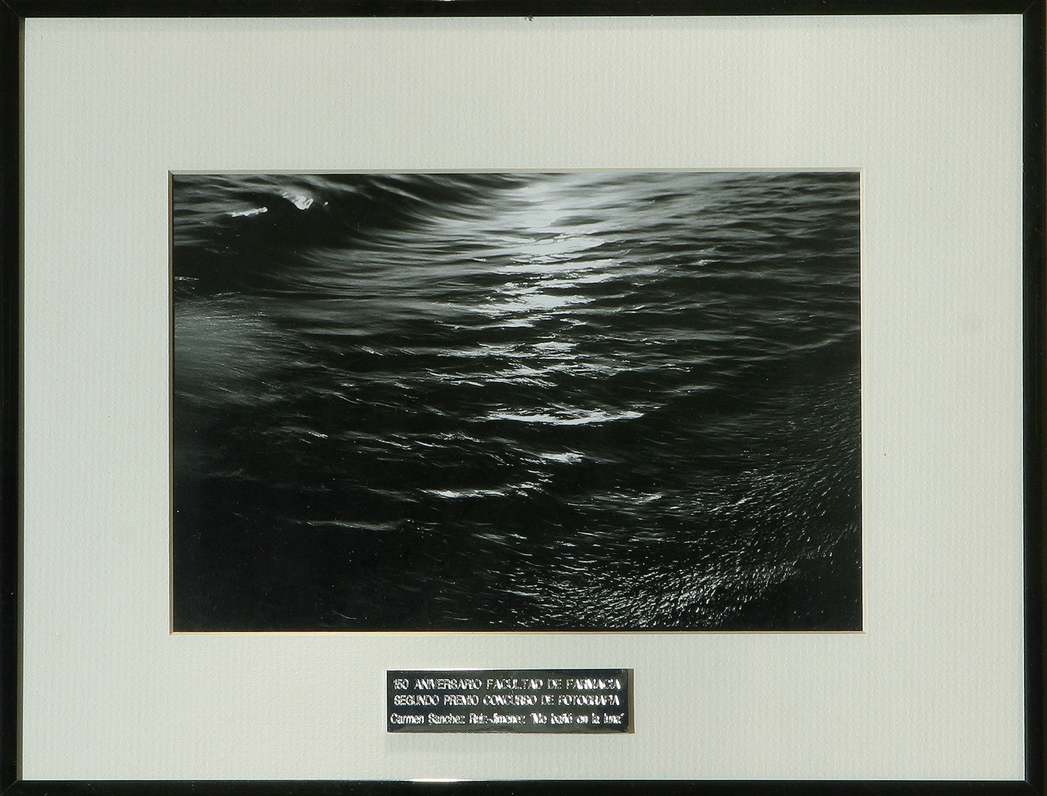 Placa adherida al paspartú con la siguiente inscripción: "150 ANIVERSARIO DE LA FACULTAD DE FARMACIA/ SEGUNDO PREMIO DEL CONCURSO DE FOTOGRAFÍA/ CARMEN SANCHEZ+RUTH JIMÉNEZ" ME BAÑO EN LA LUNA".