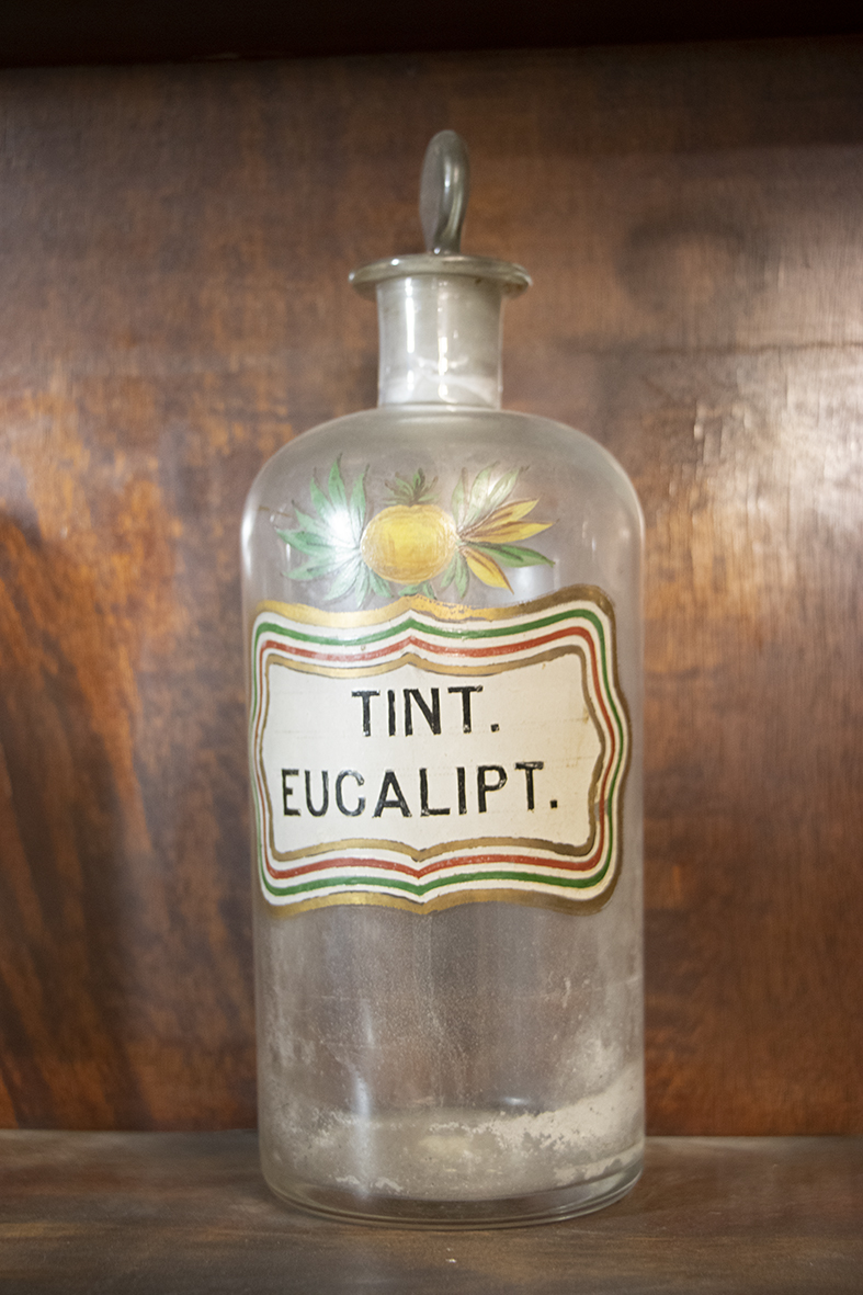 Bote cilíndrico de vidrio transparente, cuello corto y boca estrecha con reborde plano que se cierra mediante un tapón realizado también en vidrio esmerilado transparente. Forma parte del conjunto de botes farmacéuticos de la Farmacia Zambrano, identificables todos ellos por contar con un mismo diseño decorativo de cartela que aparece pintada sobre el propio bote, con un fondo blanco donde aparece, en negro y en mayúsculas, el nombre de su contenido, en este caso “TINT./EUCALIPT.”. Decoran el perímetro de la cartela mixtilínea cuatro franjas de color (dorado, rojo, verde y nuevamente dorado) que se intercalan con tres franjas blancas, siendo la última, dorada, algo más gruesa que el resto. Centrado sobre la cartela, un motivo vegetal formado por lo que parece ser una naranja con hojas en abanico a ambos lados remata la composición.
