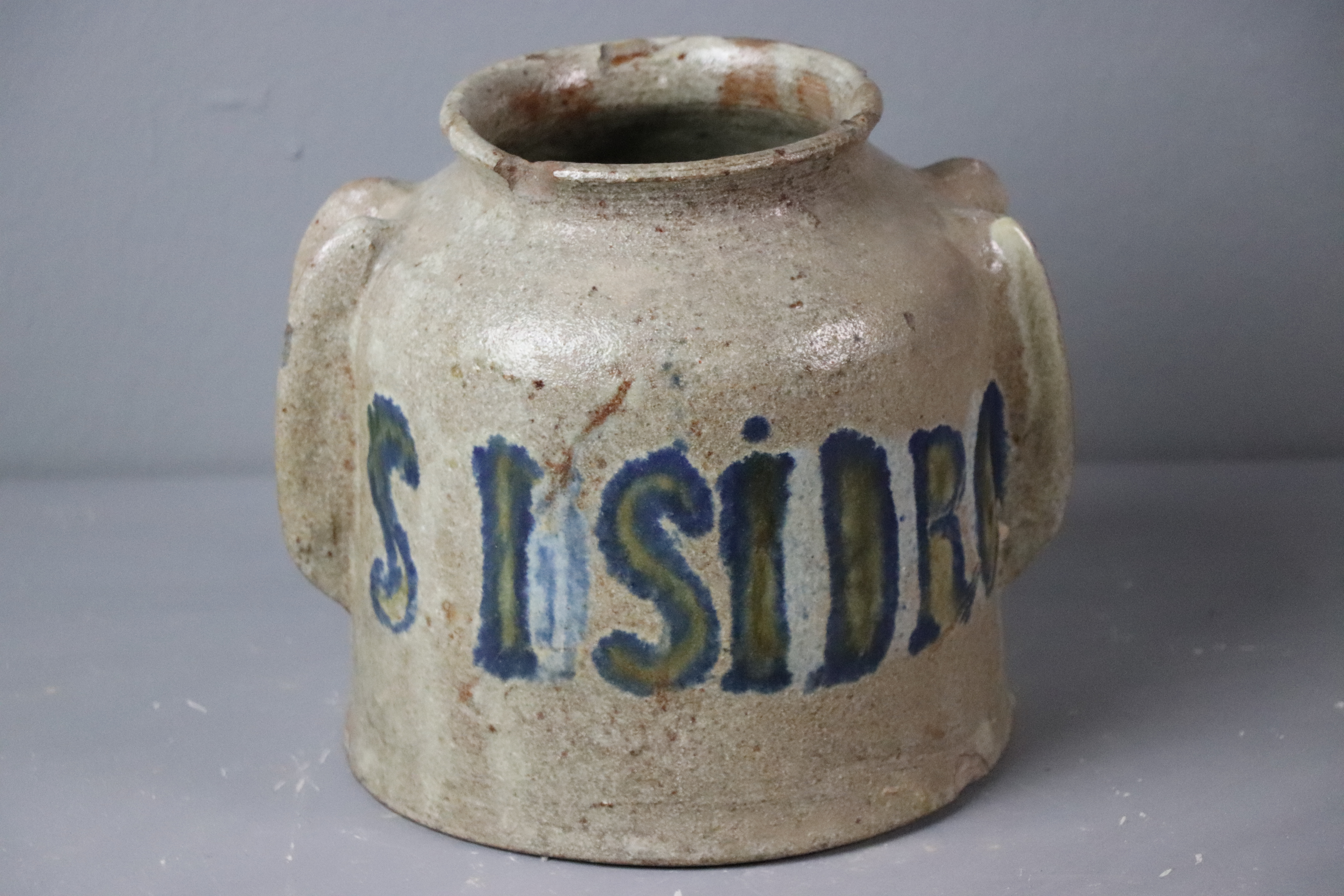 Tarro de apoyo modelado en arcilla y torneado en pella chica que cuenta con inscripciones esmaltadas en azul cobalto: “S. Isidro / Año 1923”. La pieza responde a una tipología sencilla de boca mucho más estrecha que el diámetro y cuenta con dos asas pegadas con forma de herradura para facilitar el agarre.