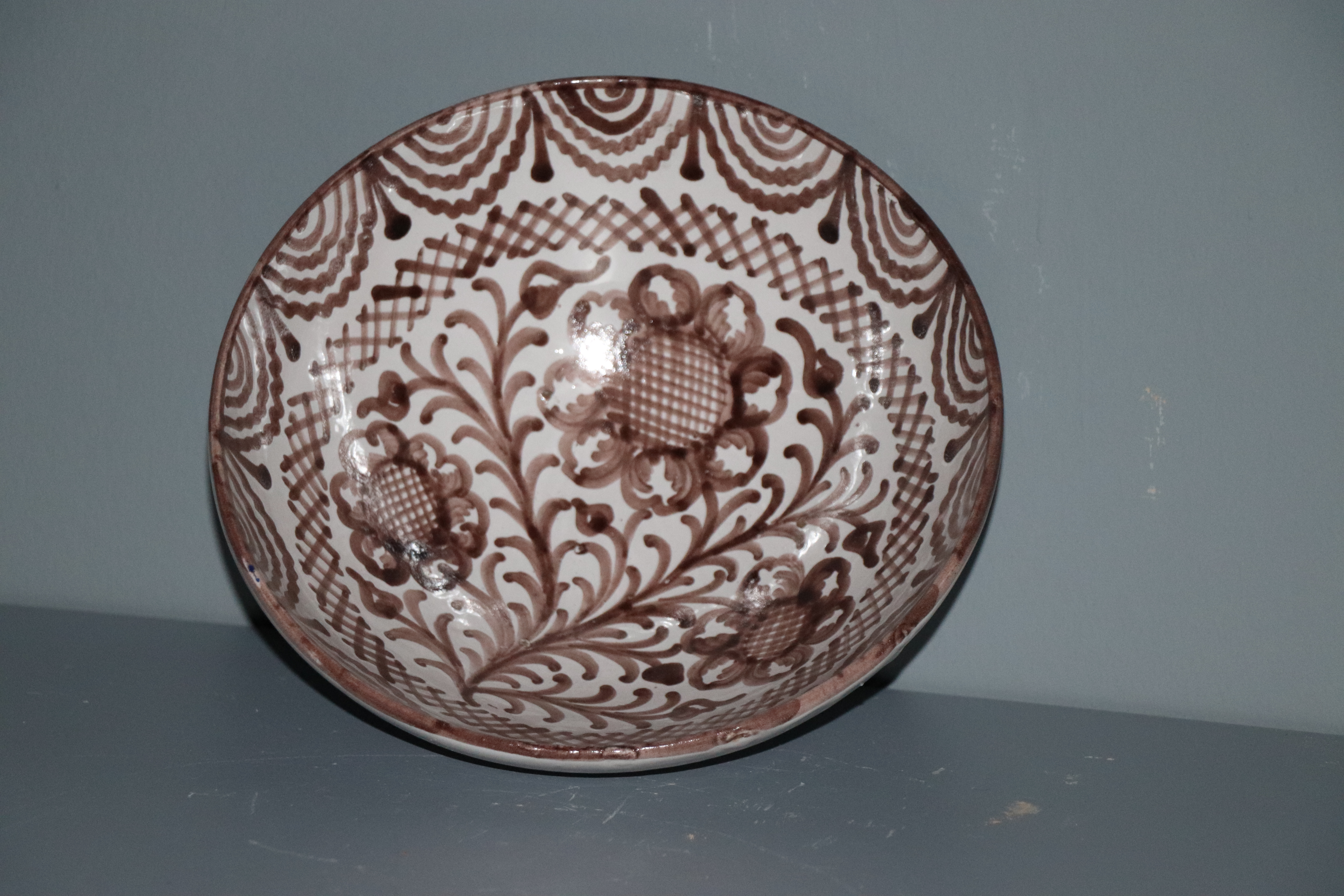 Tazón de cerámica granadina modelado en arcilla, torneado en pella y horma y esmaltado en blanco con decoración repintada monocroma de marrón óxido de manganeso.