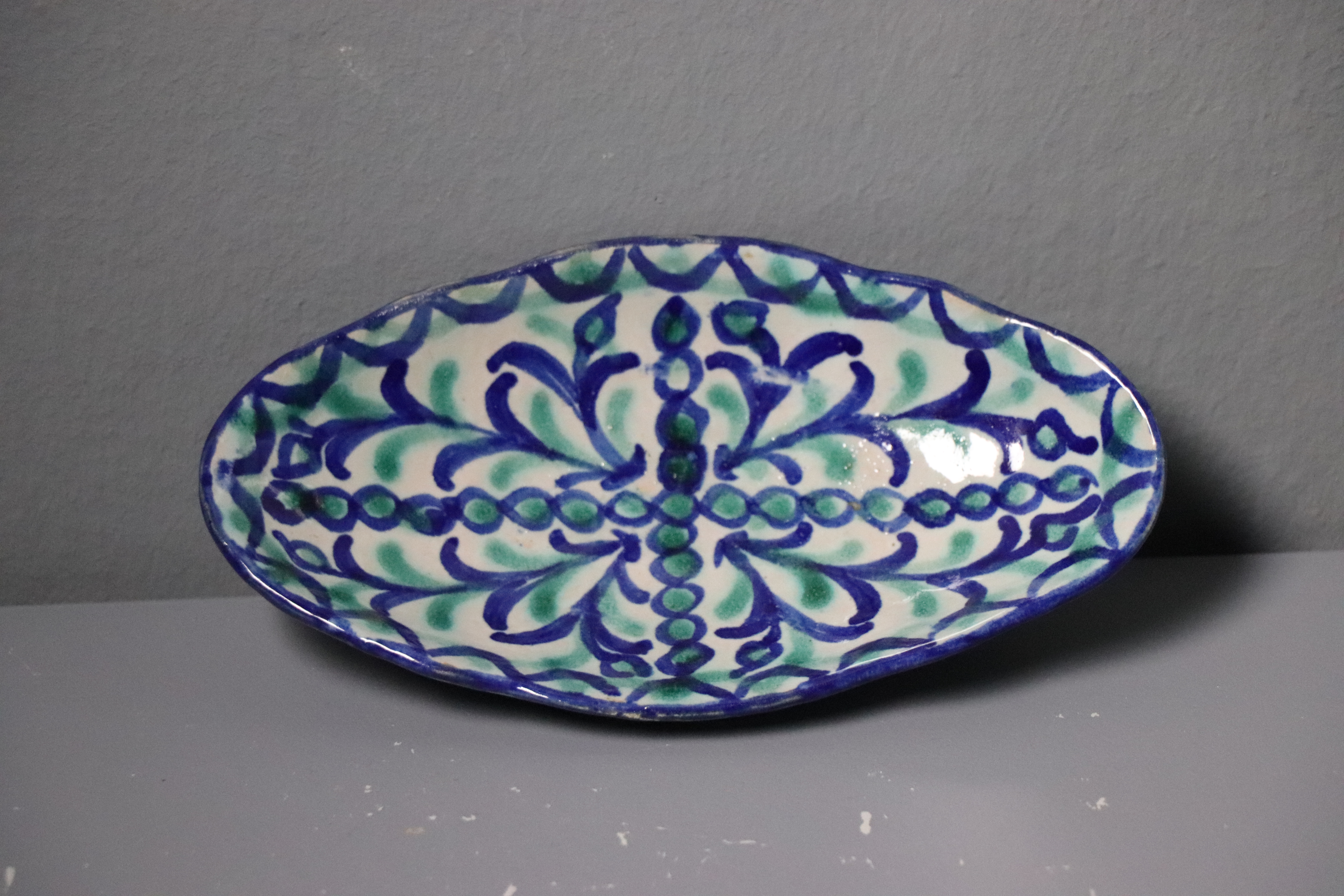 Esta rabanera granadina está modelada en arcilla, torneada en pella grande y esmaltada en blanco con decoración repintada en azul cobalto y verde óxido de cobre. Presenta en torno al ala cenefas a modo de guirnaldas; mientras que la torta está subdividida en cuatro partes a partir de una cadeneta de círculos en dos secciones que forman una cruz, rodeada por motivos vegetales.
