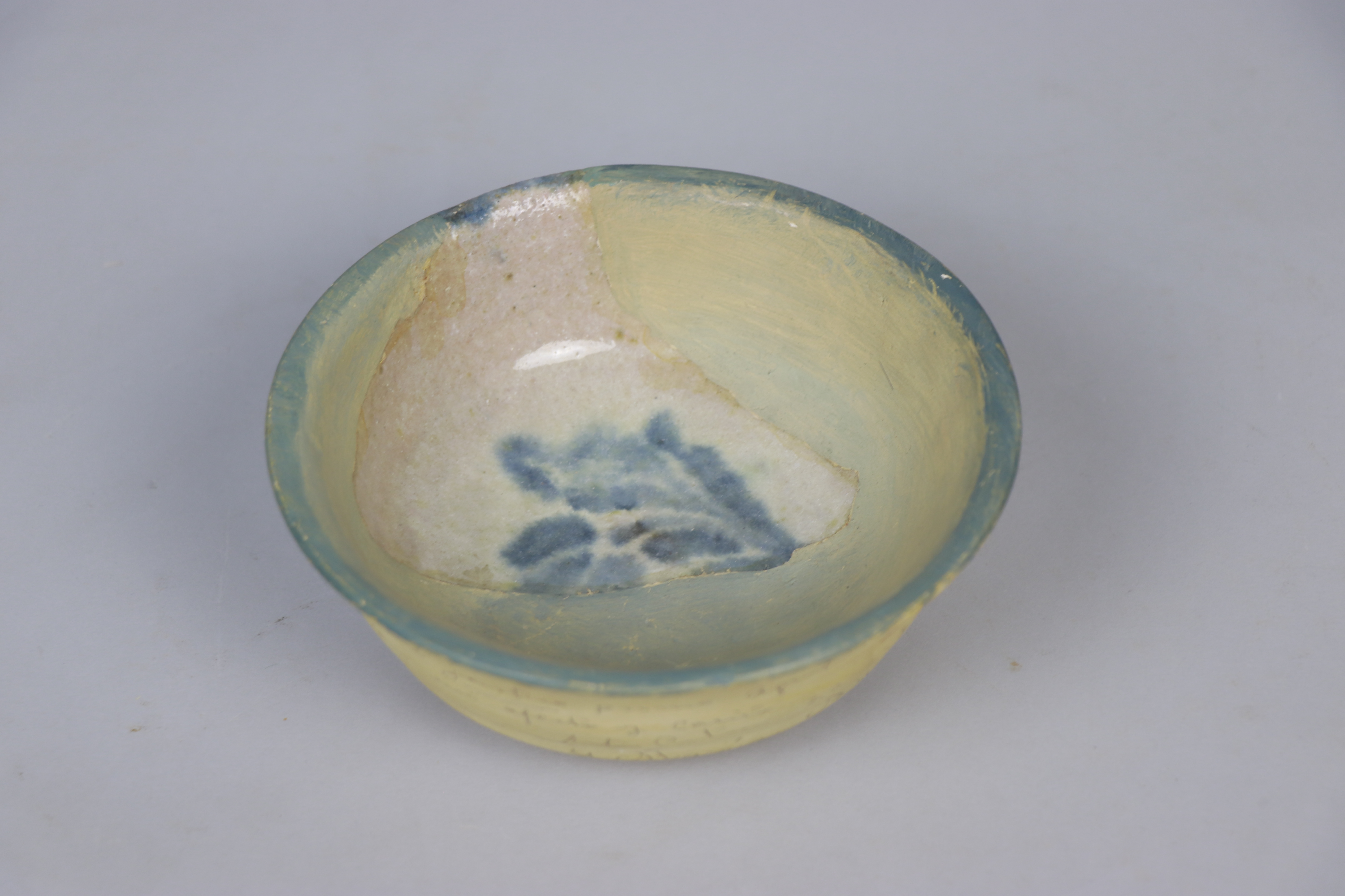 Este cuenco de cerámica granadina está modelado en arcilla, torneado en pella grande y esmaltado en blanco con decoración corriente monocroma en azul cobalto. En el interior cuenta con un motivo vegetal que refleja la ornamentación prototípica de la cerámica de tradición nazarí.