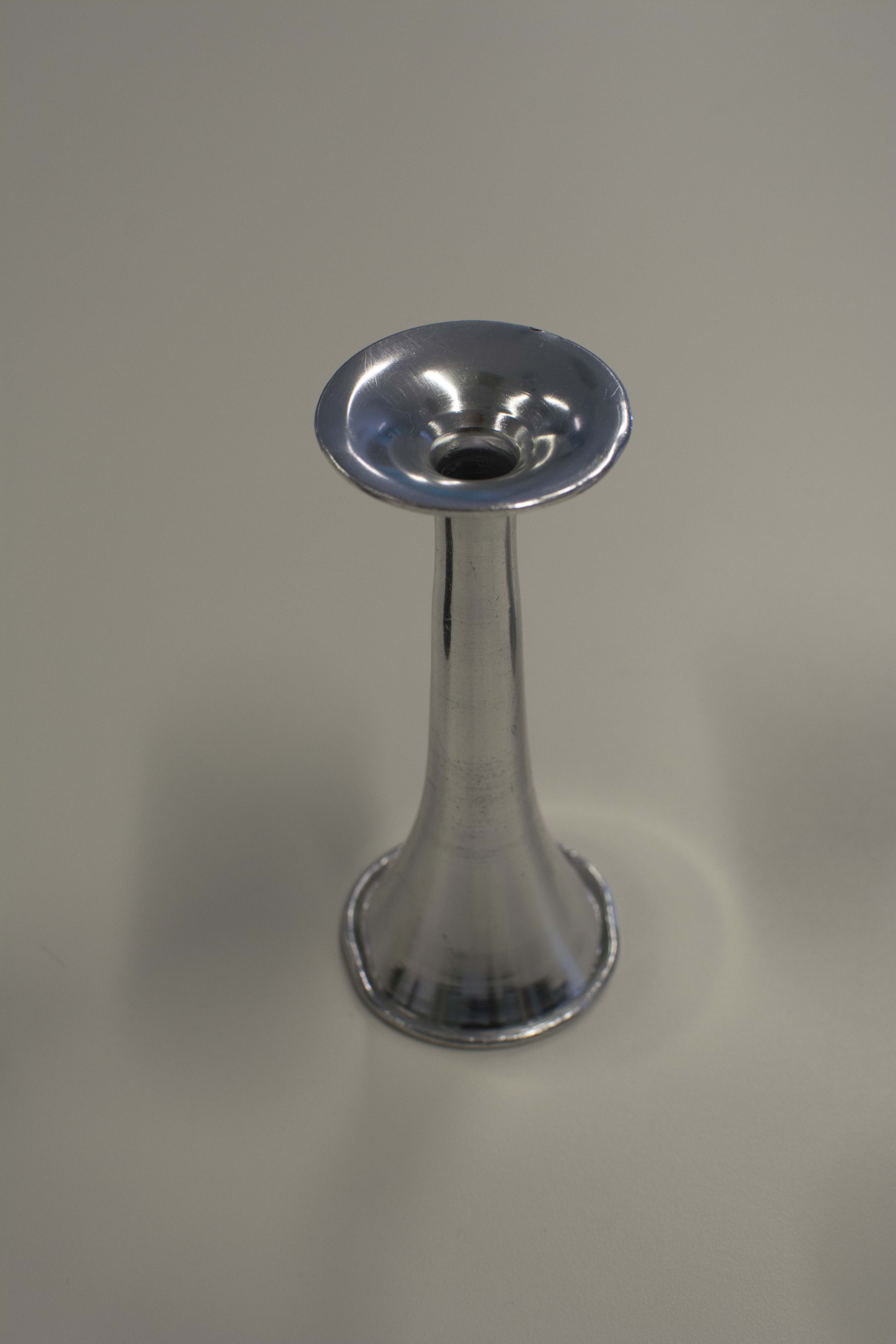 Estetoscopio de Pinard fabricado en aluminio y utilizado, por su tipología, para escuchar los sonidos cardiacos del feto en la práctica obstétrica.