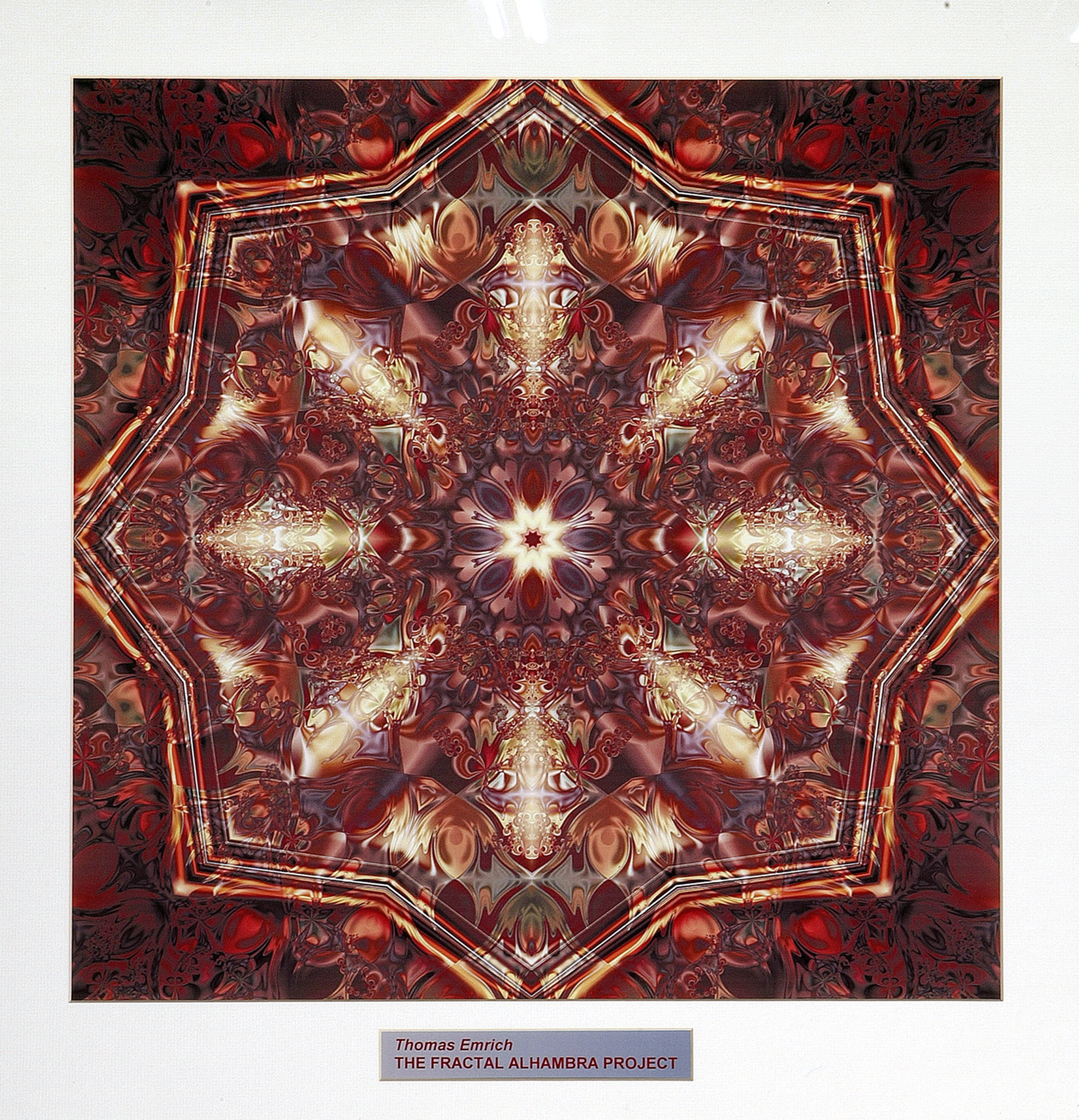 Composición fractal en forma de estrella de ocho puntas cuyo borde, de un naranja brillante, se dibuja sobre un complejo fondo de colores carmín y violeta grisáceo. En el centro, una pequeña estrella blanca centrada por un círculo carmín, de la que salen cho destellos blancos que se extienden de forma radial hacia los vértices de la estrella más grande. La estrella de ocho puntas generada por dos cuadrados concéntricos a 45º, también conocida como estrella tartésica, era típica de las antiguas civilizaciones mediterráneas y se encuentra en numerosos elementos decorativos de la Alhambra, como alicatados, rejas y mocárabes.