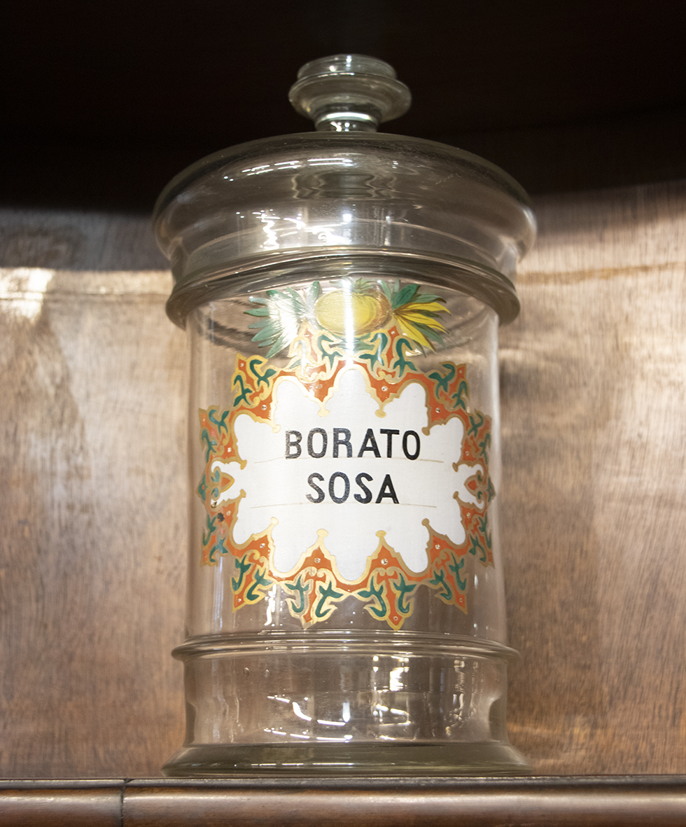 Bote cilíndrico de vidrio transparente con boca de igual anchura a la base y tapa de vidrio en forma de semiesfera achatada con asidero de forma troncocónica invertida y un reborde más ancho en la parte superior. Forma parte del conjunto de botes farmacéuticos de la Farmacia Zambrano, identificables todos ellos por contar con un mismo diseño decorativo de cartela que aparece pintada sobre el propio bote, de estructura ovalada, con un fondo blanco donde  aparece, en negro y en mayúsculas, el nombre de su contenido, en este caso “BORATO/SOSA”; su perímetro se remata mediante una cenefa de aire arabesco con decoración vegetal esquemática en rojo minio y azul verdoso perfilada en dorado. Centrado sobre la cartela, un motivo vegetal formado por lo que parece ser una naranja con hojas en abanico a ambos lados remata la composición, este elemento se repite en todo el botamen produciéndose variaciones en la forma y orlado de la cartela.