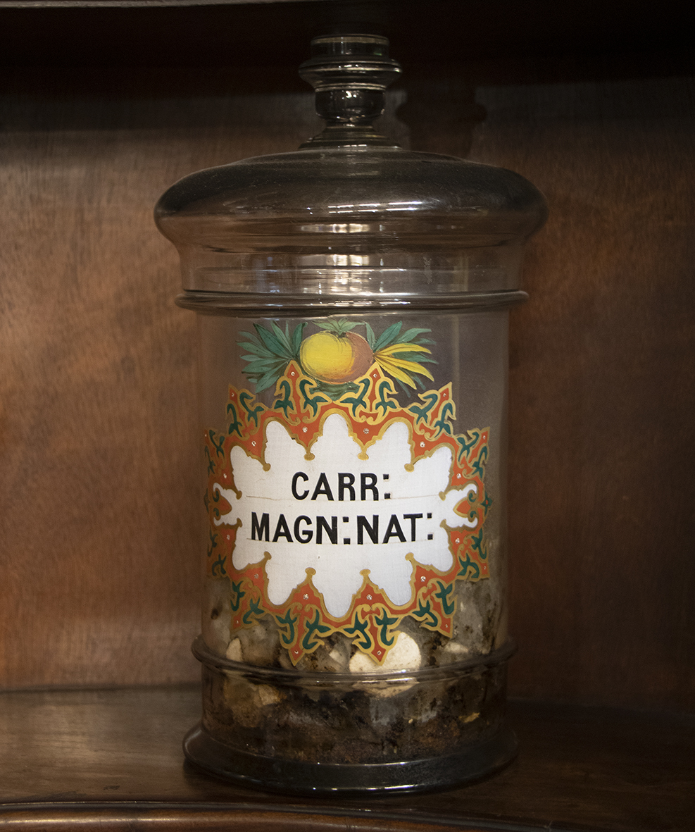 Estos botes formaban, junto con los albarelos y los frascos de vidrio, el conjunto de botamen de unas 453 piezas de la Farmacia. Su forma específica de boca ancha está ligada a su uso para contener sólidos como granulados, pastillas, polvos, plantas medicinales…