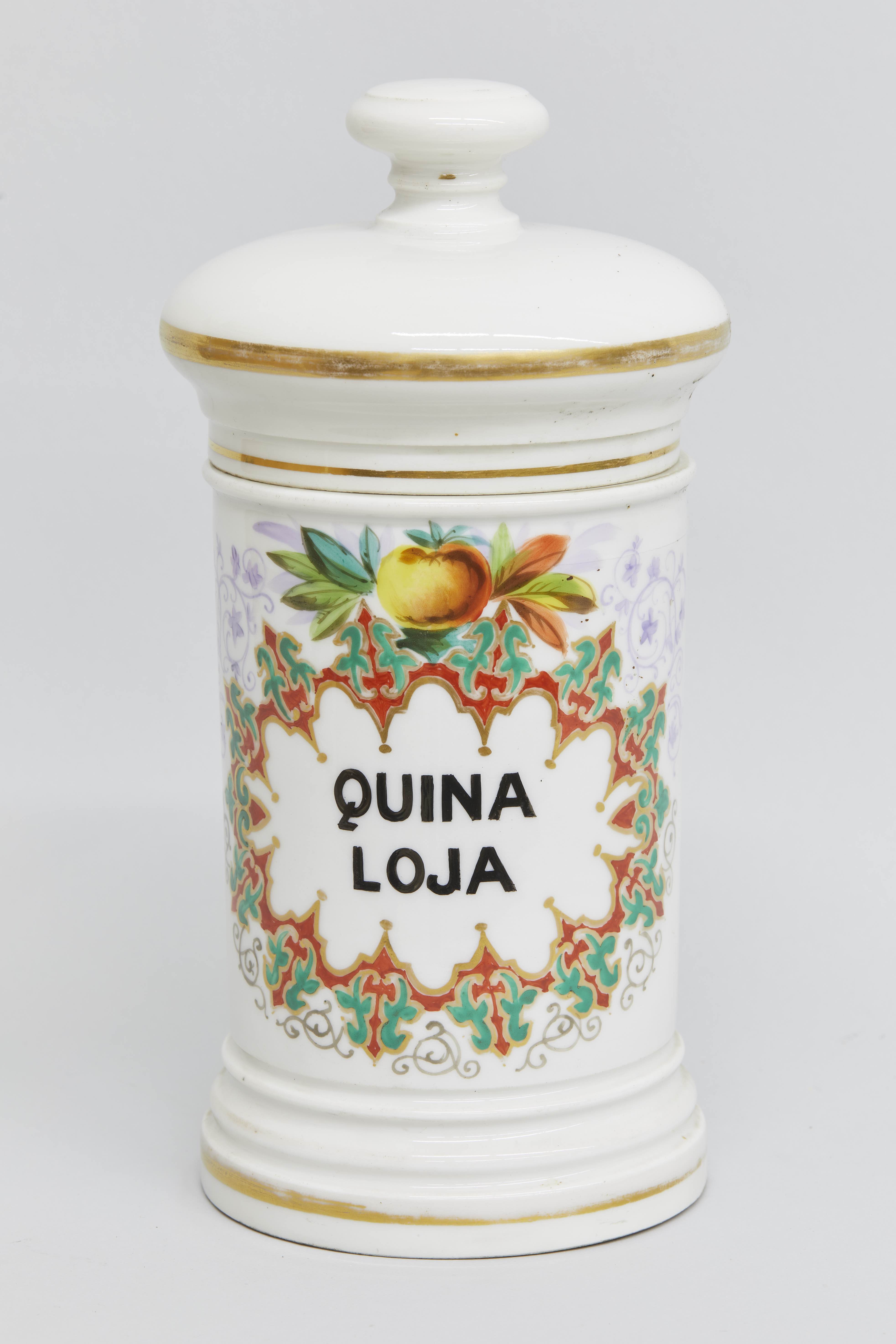 En el caso de estos últimos, la cartela, pintada sobre el propio albarelo, sigue una estructura ovalada en cuyo centro aparece, en negro y en mayúsculas, el nombre de su contenido “QUINA/LOJA”; lo rodea una cenefa decorativa de aire arabesco con decoración vegetal esquemática en rojo minio y azul verdoso perfilada en dorado. En los huecos generados por esta orla hacia el exterior, en su mitad inferior, se intercalan una serie de motivos vegetales aislados de trazo muy fino en tono dorado grisáceo y, en los extremos superiores se desarrollan en una mayor estructura de ramas, hojas y flores de color violeta tenue. Centrado sobre la cartela, un motivo vegetal formado por lo que parece ser una naranja con hojas en abanico a ambos lados remata la composición.