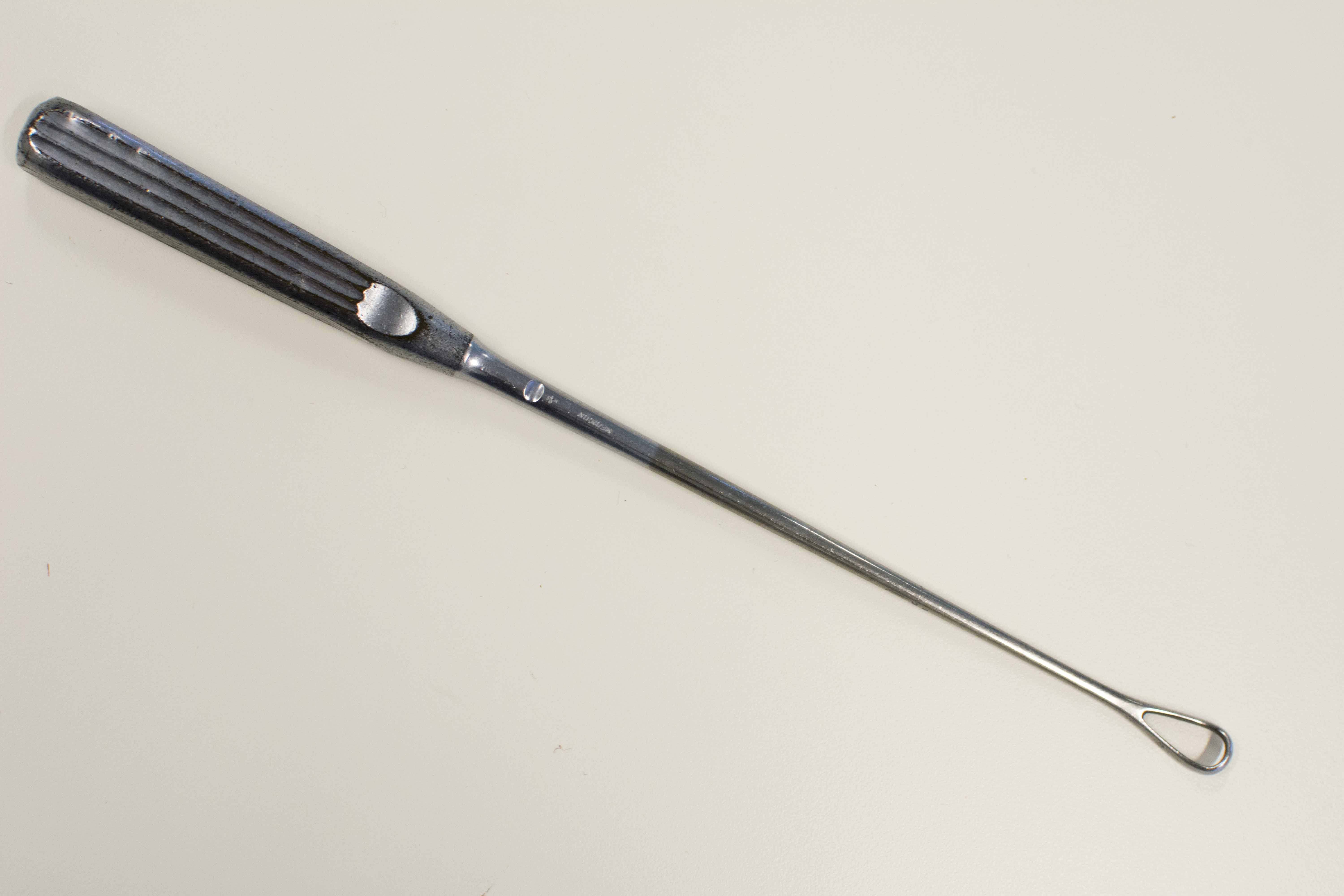 Cureta uterina de Recamier. Instrumento de uso obstétrico que cuenta con una empuñadura de forma troncopiramidal con el final ligeramente abombado y acanaladuras verticales que permiten el agarre. De esta parte un vástago rematado en un terminal con forma de cuchara hueca de bordes cortantes, utilizado para raspar el interior de la cavidad uterina.
