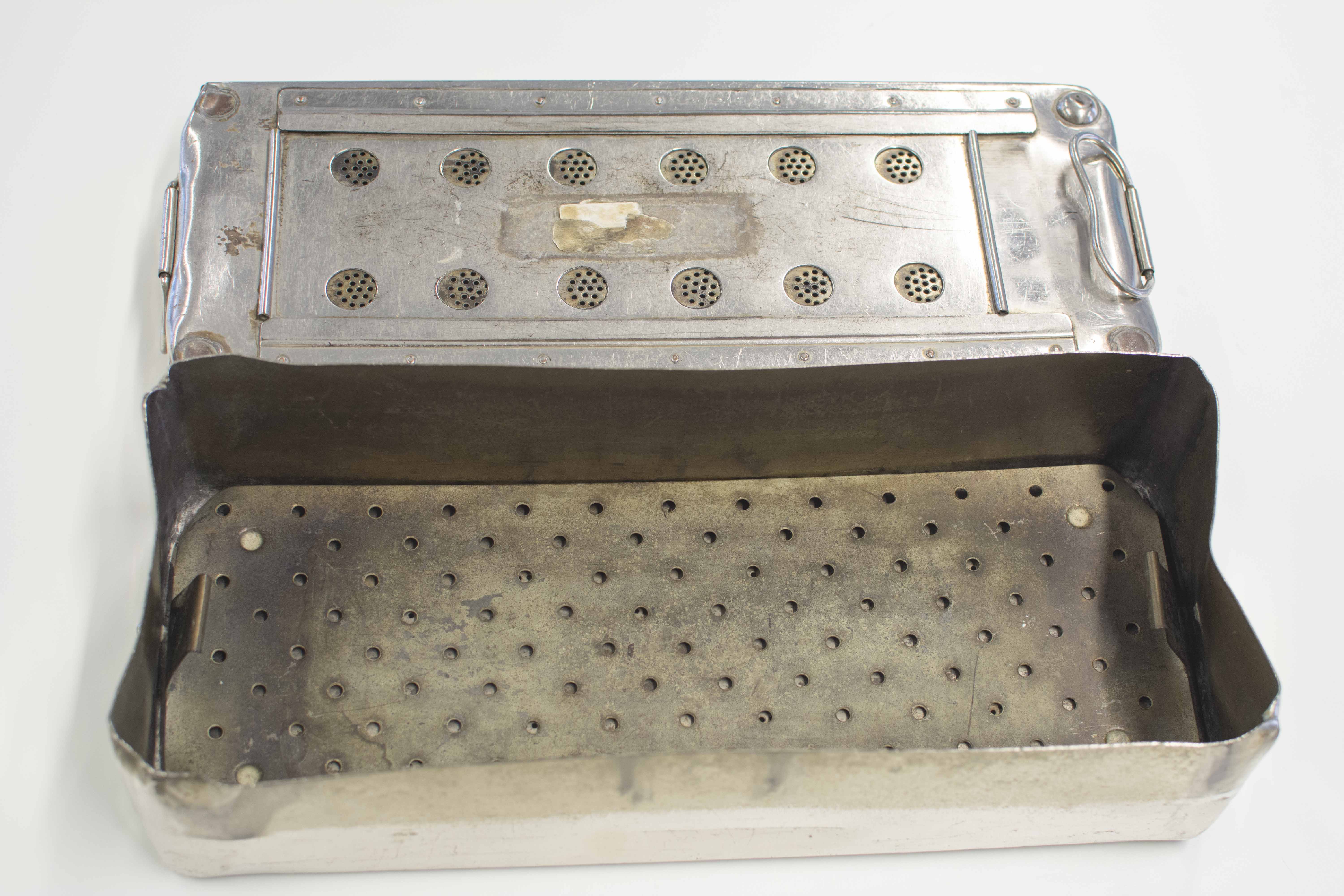 Caja de acero inoxidable utilizada para la esterilización y posterior conservación de instrumental quirúrgico y de consulta. Compuesta por un recipiente rectangular con tapadera hermética y una rejilla. Bajo la rejilla se introducen pastillas de formol para conservar el material estéril.