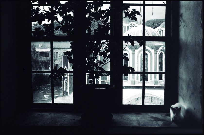 La fotografía, en blanco y negro, nos muestra un gran ventanal cuyas vistas, posiblemente, correspondan al Monasterio de Iviron. A la derecha podemos apreciar un gato blanco que descansa sobre la repisa junto con una gran planta ubicada justo en la parte central del ventanal.
