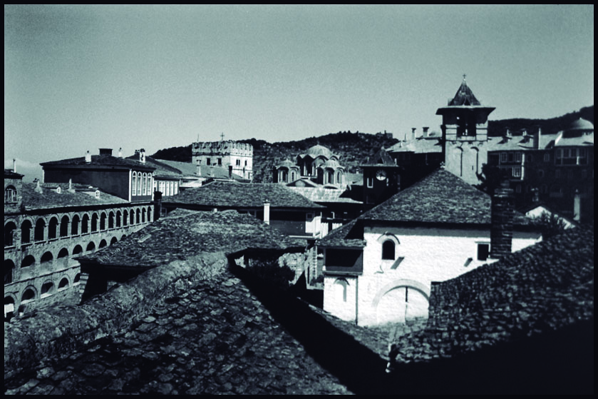 La fotografía, en blanco y negro, nos muestra una vista de los tejados, algunos de ellos a dos aguas, del Monasterio de Vatopediu, en el Monte Athos. La imagen es muy heterogénea en cuanto a que muestra construcciones de distintos estilos, destacando al fondo uno de estilo bizantino.