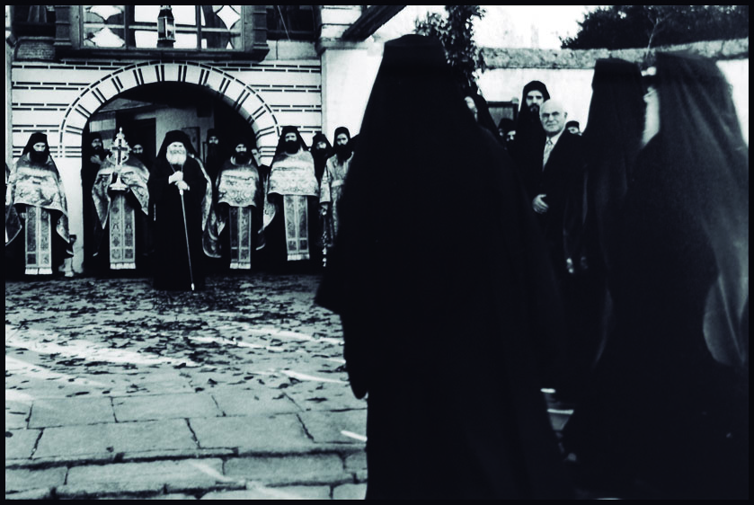 Fotografía del momento de recepción de las autoridades en la festividad del Cinturón de la Virgen en el Monasterio de Vatopediu. Apreciamos un amplio número de monjes ortodoxos, así como hombres que por su vestimenta más ornamental parecen desempeñar puestos más alto en su iglesia. La recepción se lleva a cabo al aire libre ante un arco de entrada al monasterio.