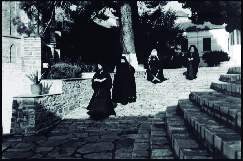 En esta fotografía en blanco y negro podemos apreciar a cuatro monjes ortodoxos a su salida del oficio religioso portando en sus manos objetos sagrados como un libro, un cáliz y bastones. Van caminando por una zona empedrada que deja la vegetación al fondo, pudiendo apreciar unas escaleras ascendentes en el lado derecho de la imagen.