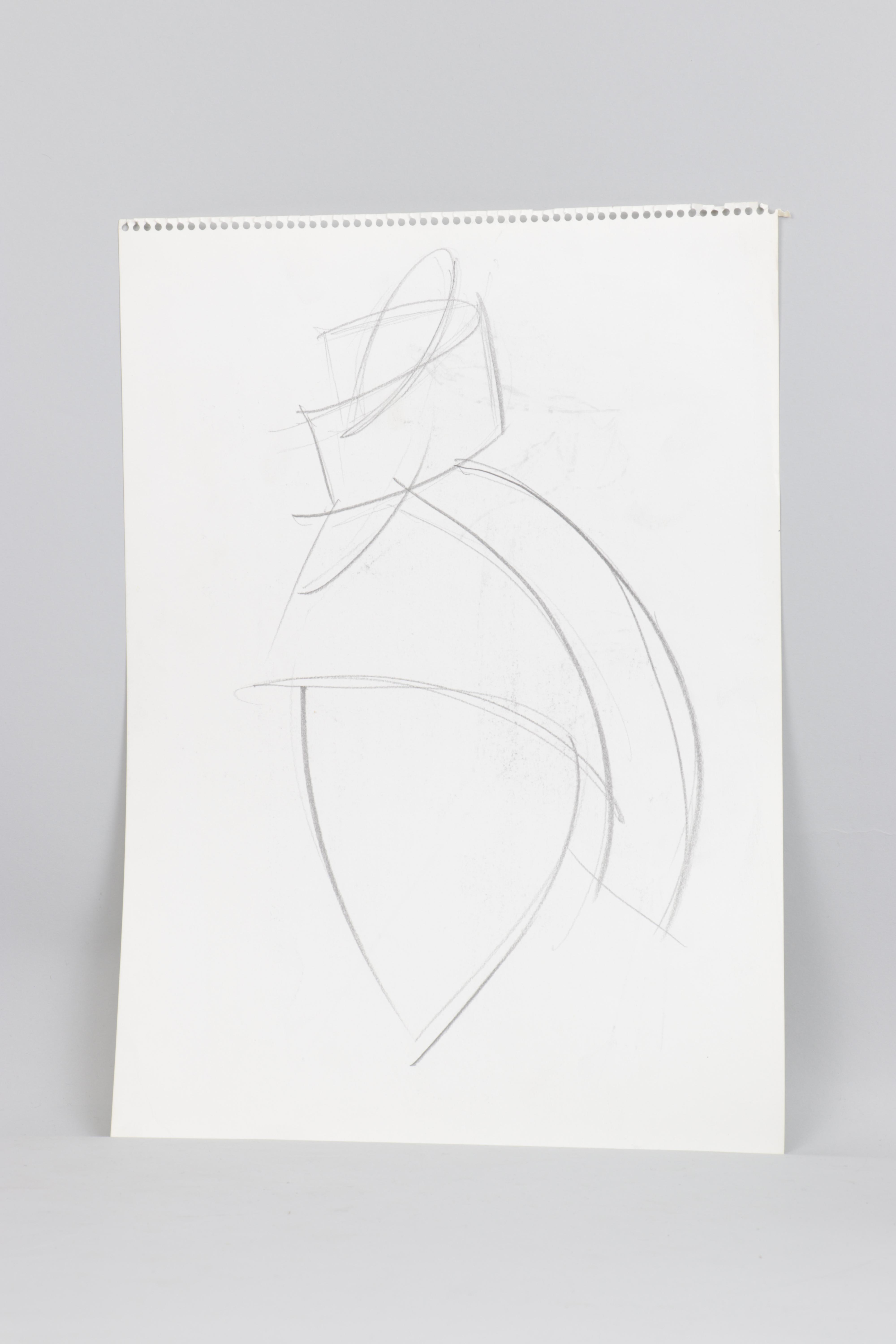 Boceto de maniquí con escaso detalle en lo que respecta a la representación de la figura humana o al propio vestido. Destacan la amplitud de líneas y el volumen del abrigo, así como el cuello chimenea que envuelve la práctica totalidad de la cabeza.